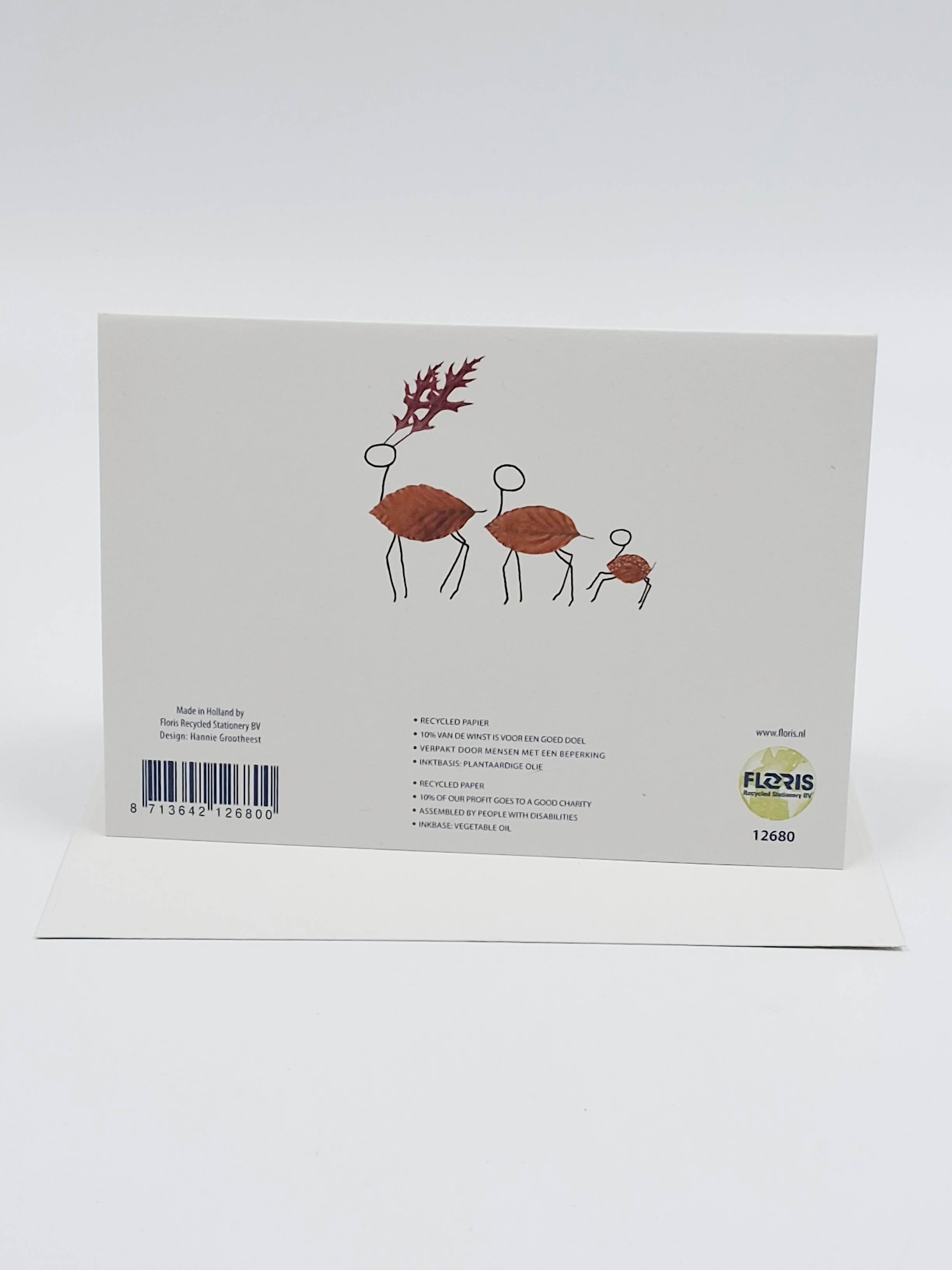 Onze wenskaarten zijn gemaakt van gerecycled papier en bedrukt met inkt op basis van plantaardige olie.