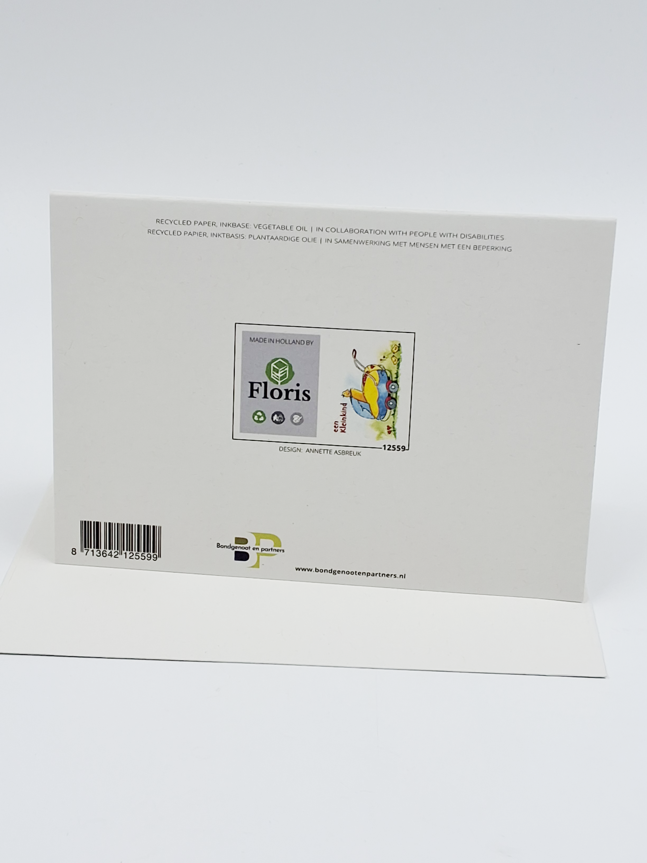 Onze wenskaarten zijn gemaakt van gerecycled papier en bedrukt met inkt op basis van plantaardige olie.
