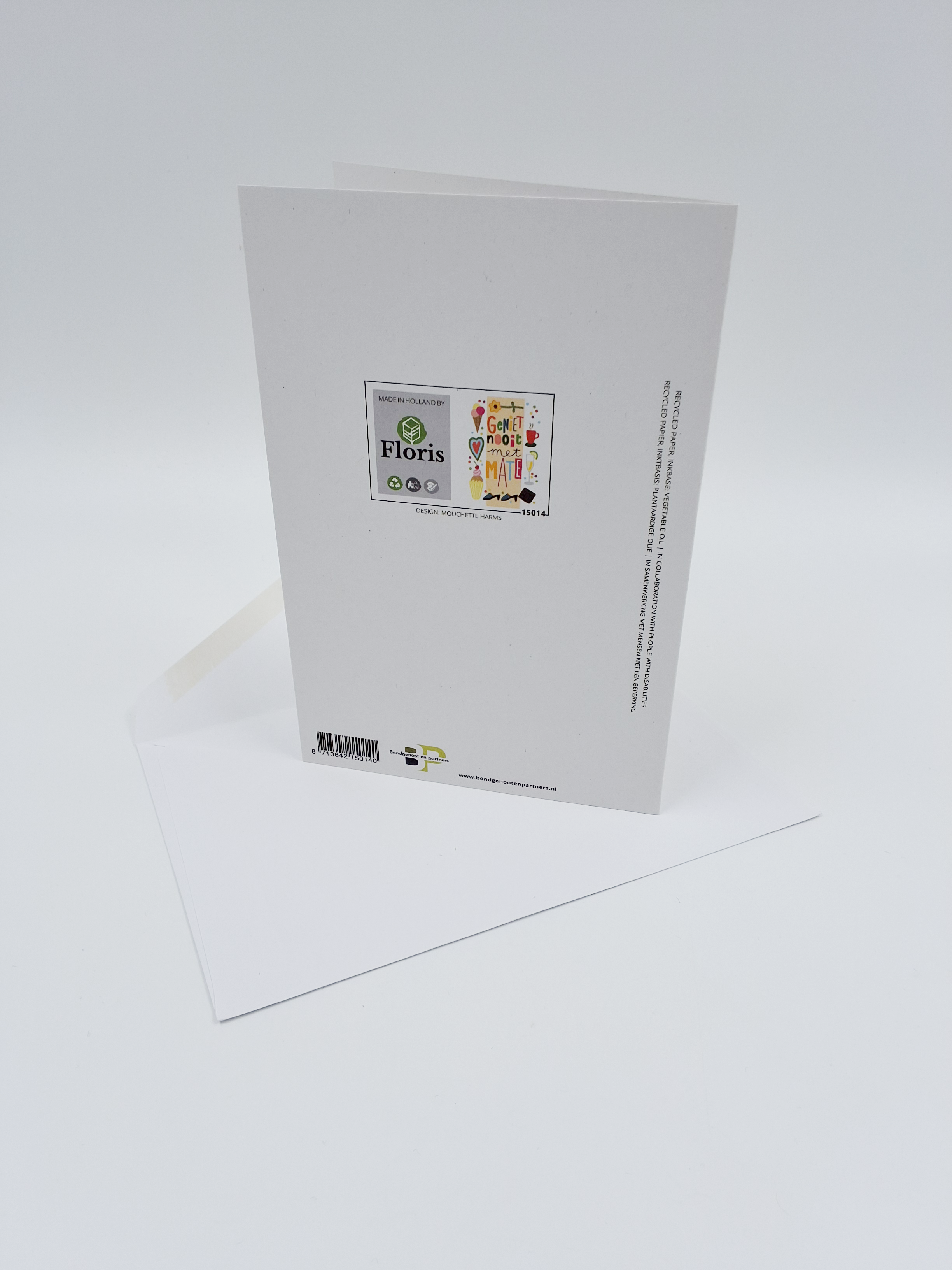 Deze wenskaart is iets groter dan een standaard wenskaart en heeft geen plastiek verpakking. Elke kaart komt met een passende envelop.