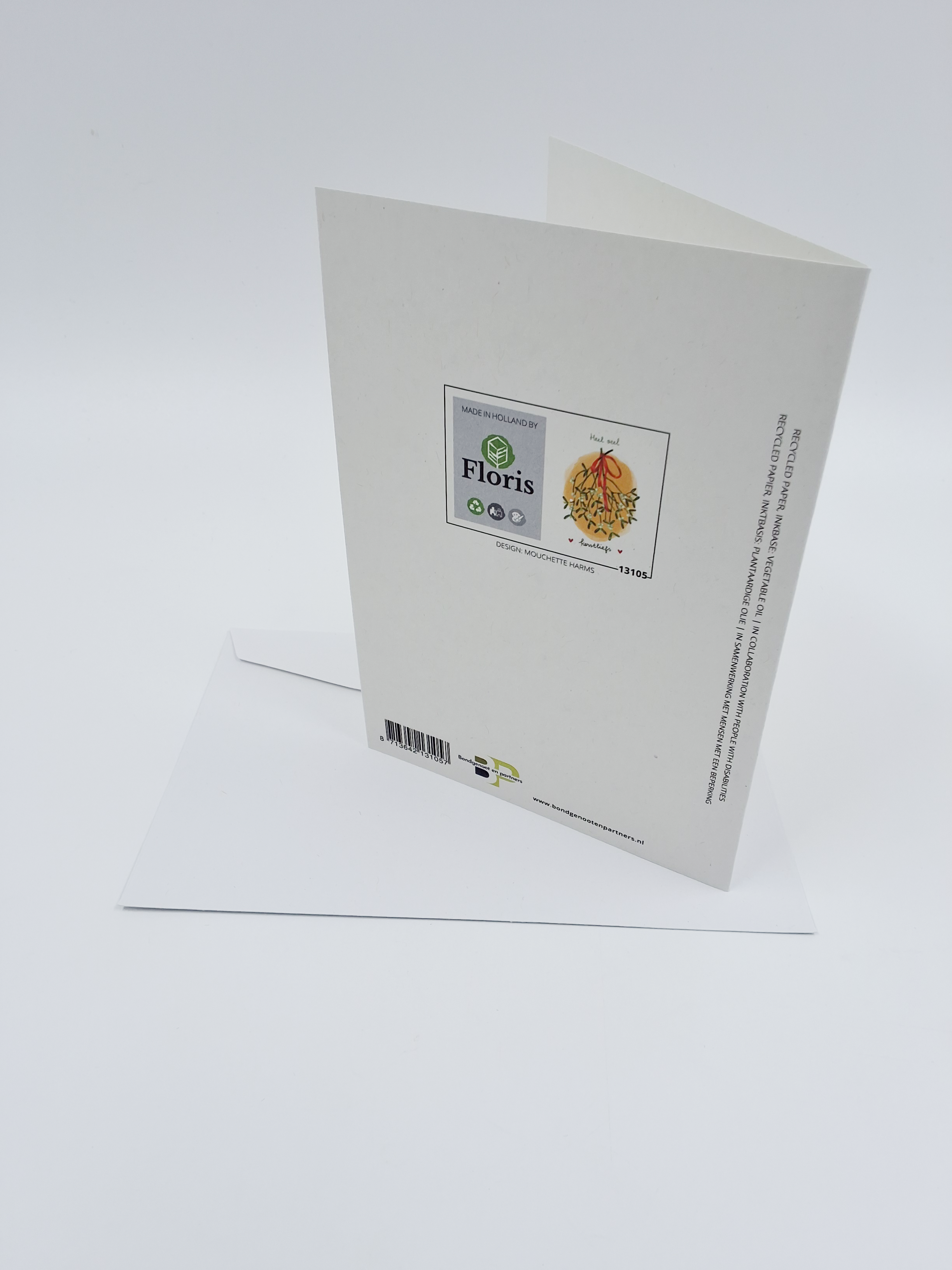 Onze kerstkaarten zijn gemaakt van gerecycled papier en bedrukt met inkt op basis van plantaardige olie.