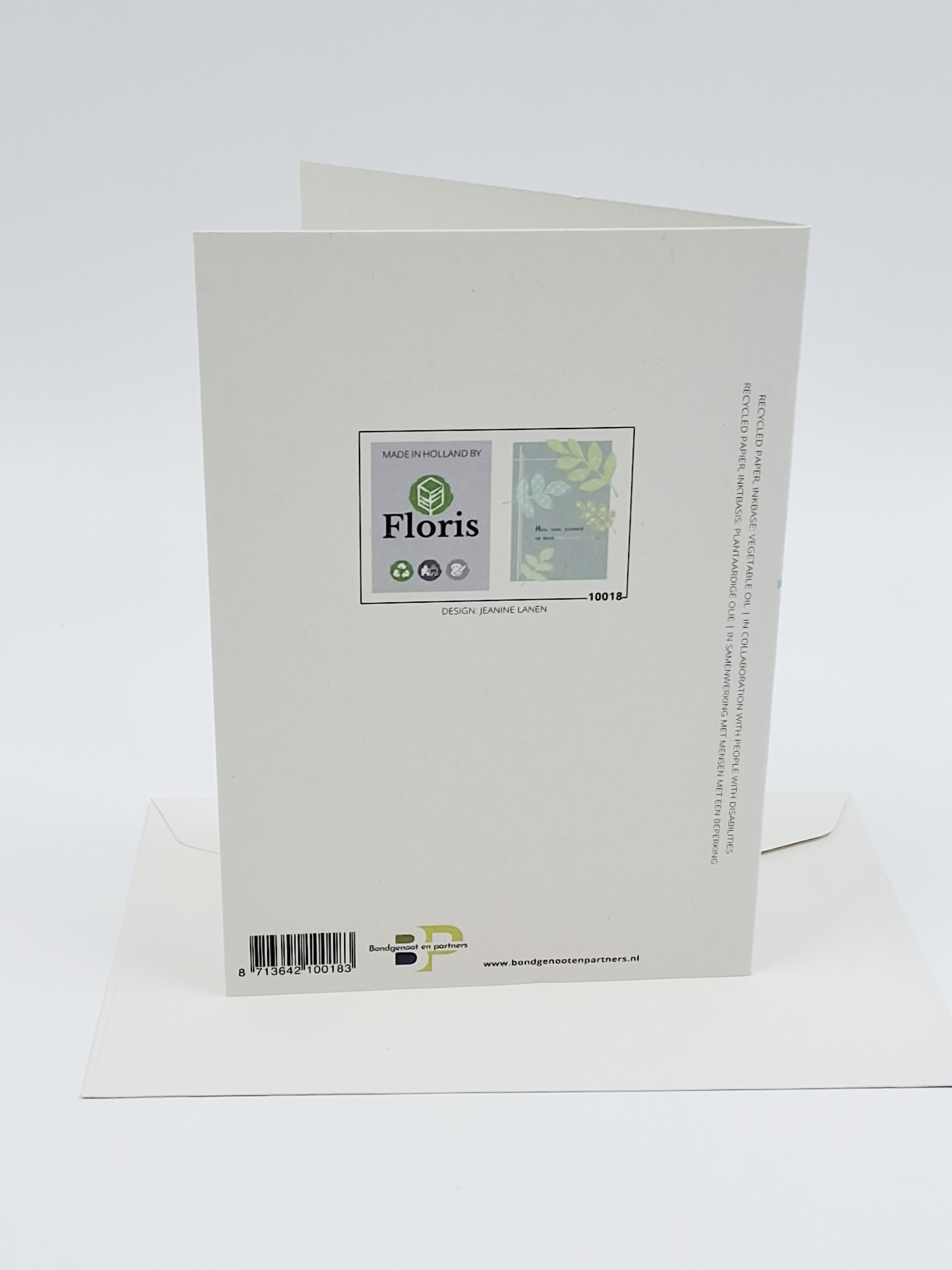 Onze wenskaarten zijn gemaakt van gerecycled papier en bedrukt met inkt op basis van plantaardige olie.