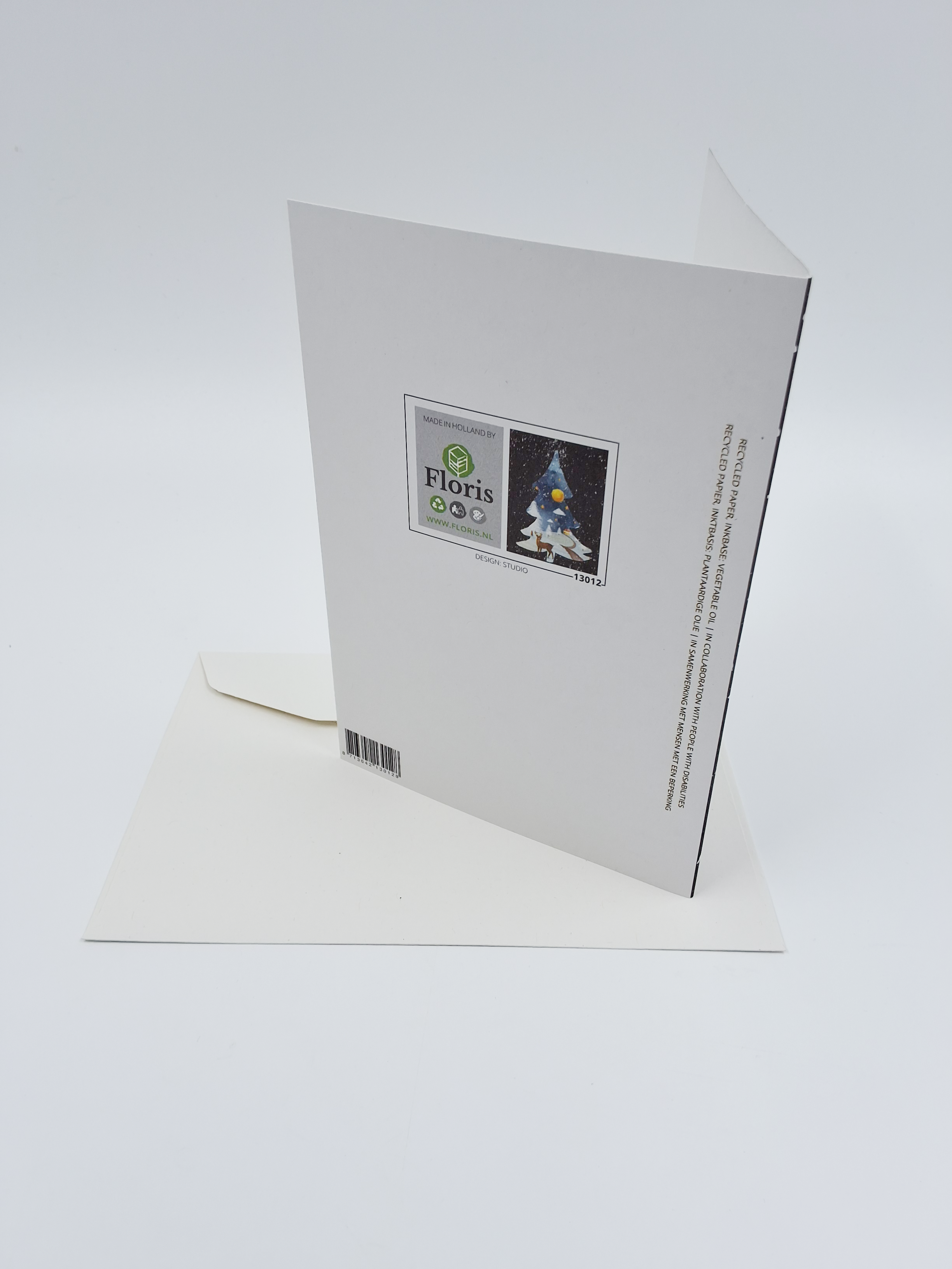Onze kerstkaarten zijn gemaakt van gerecycled papier en bedrukt met inkt op basis van plantaardige olie.