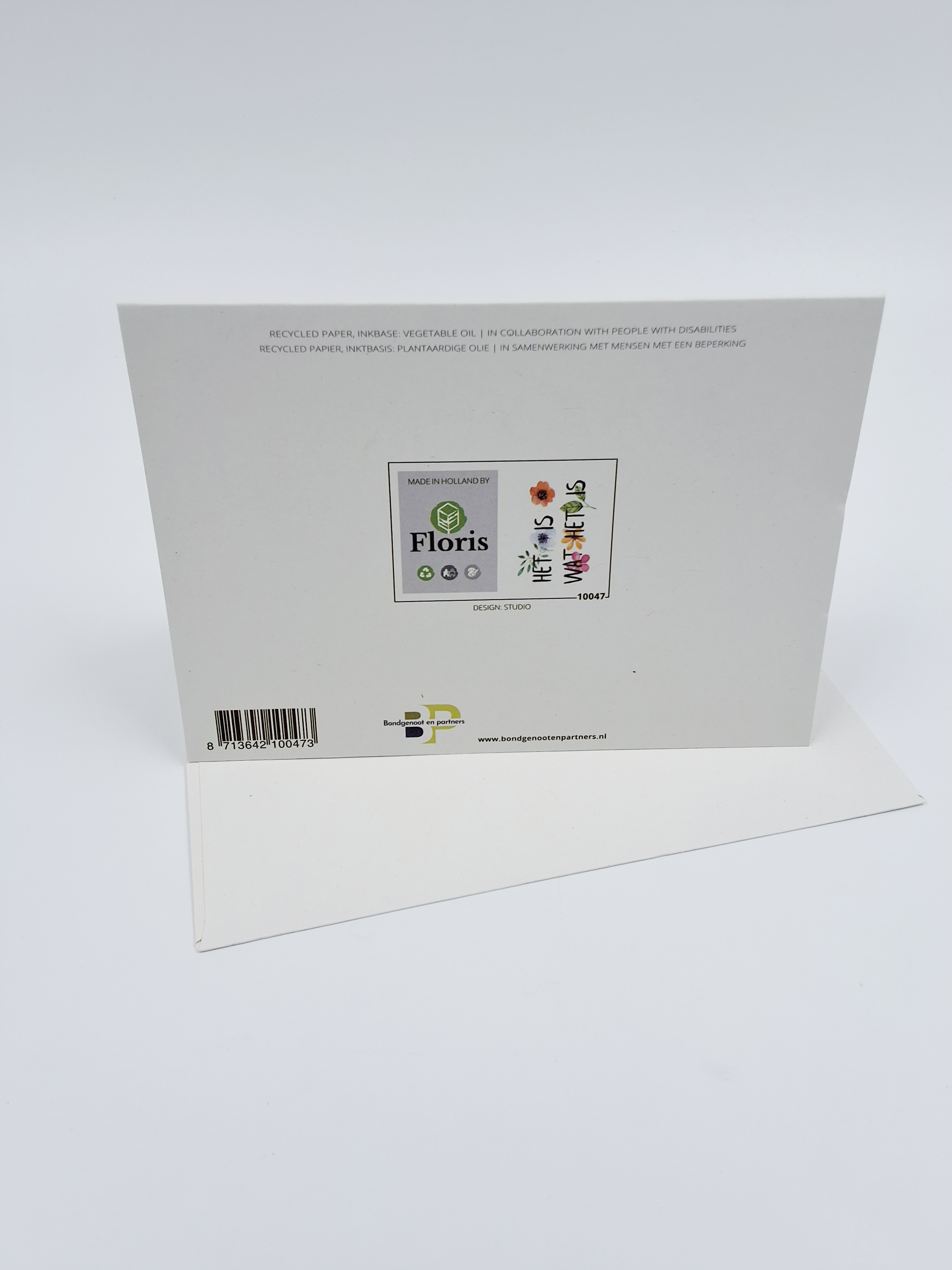Onze wenskaarten zijn gemaakt van gerecycled papier en bedrukt met inkt op basis van plantaardige olie.