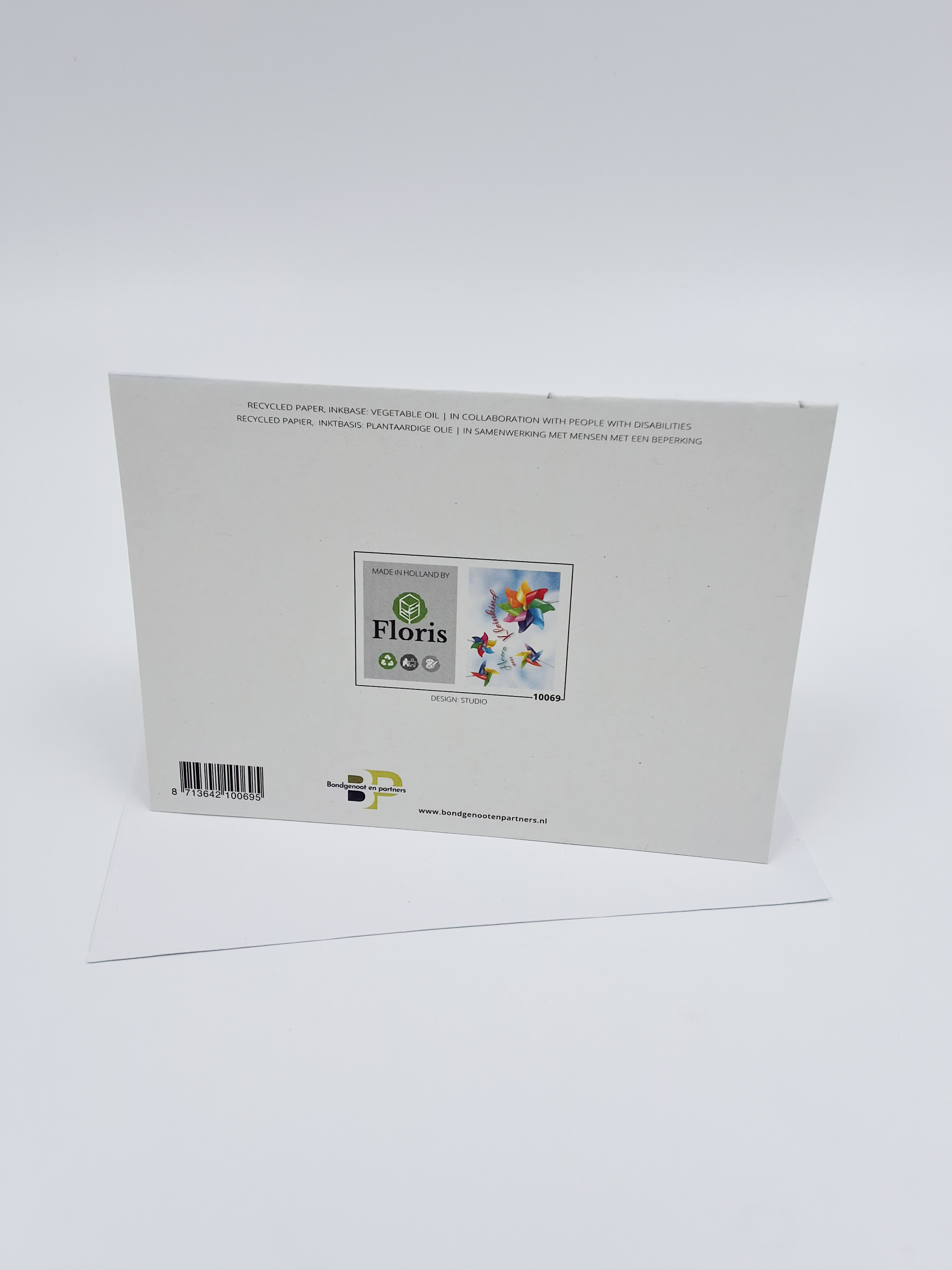 Onze wenskaarten zijn gemaakt van gerecycled papier en bedrukt met inkt op basis van plantaardige olie.