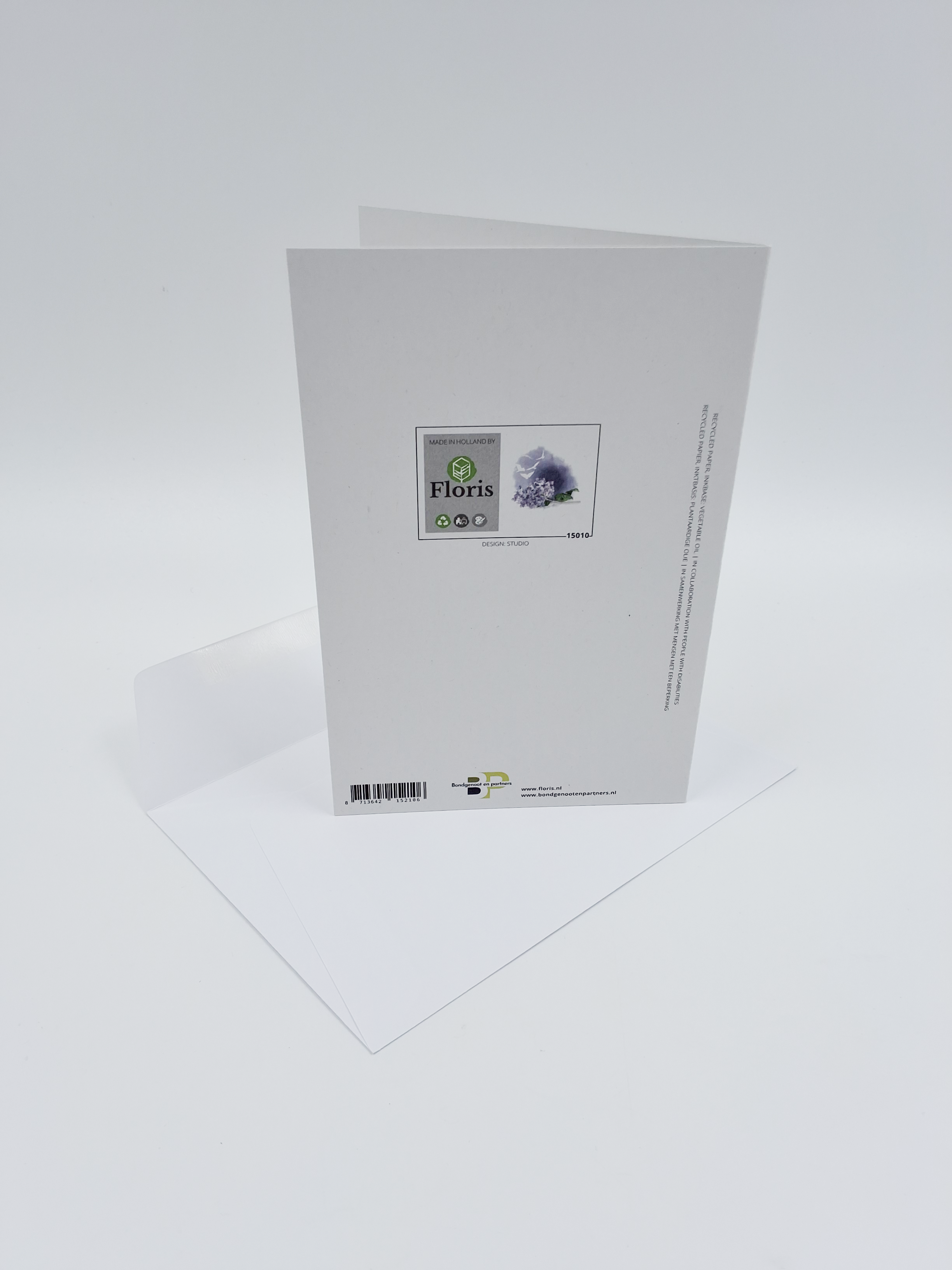 Deze wenskaart is iets groter dan een standaard wenskaart en heeft geen plastiek verpakking. Elke kaart komt met een passende envelop.