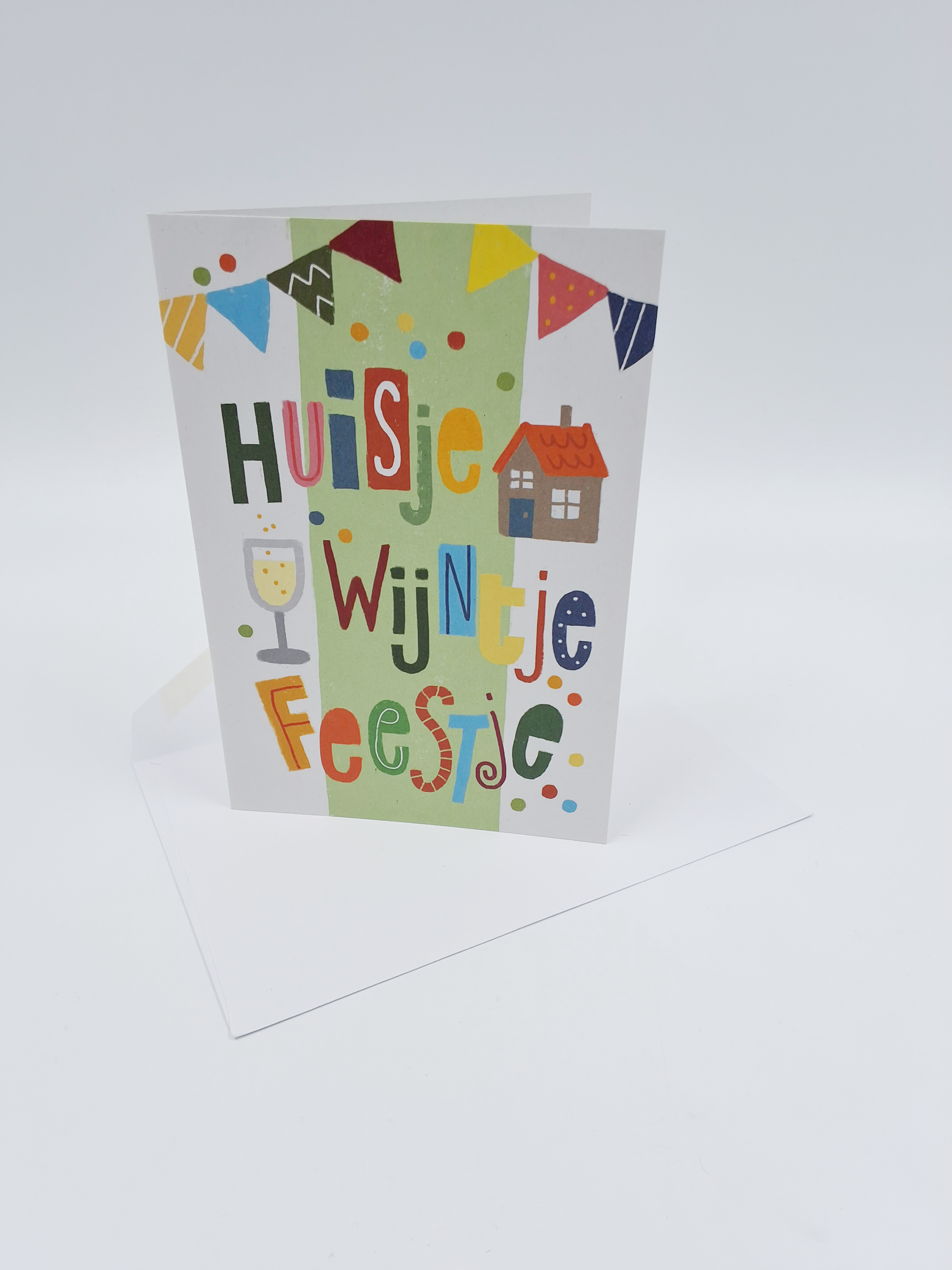 Wenskaart huisje, wijntje, feestje