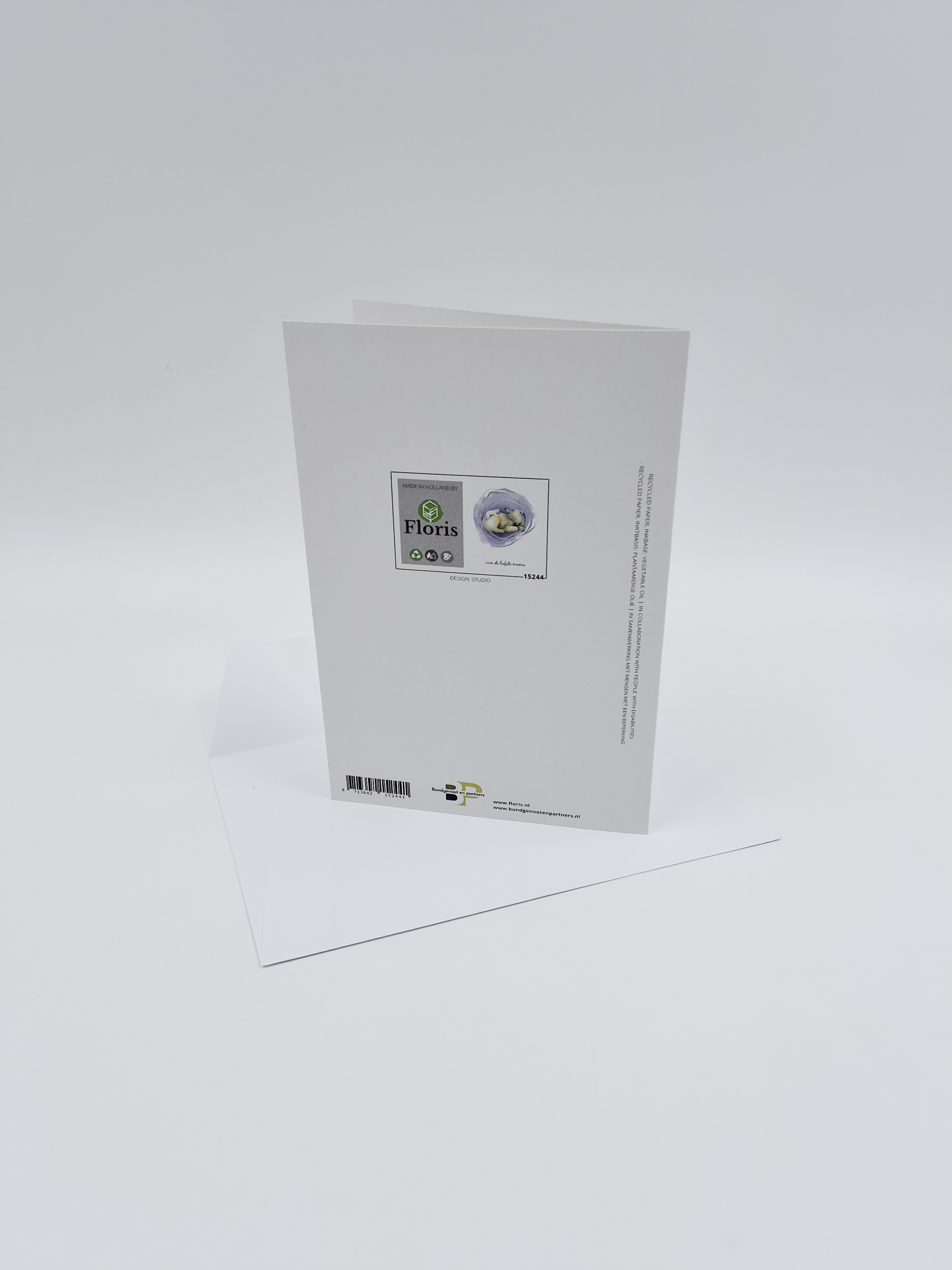 Deze wenskaart is iets groter dan een standaard wenskaart en heeft geen plastiek verpakking. Elke kaart komt met een passende envelop.