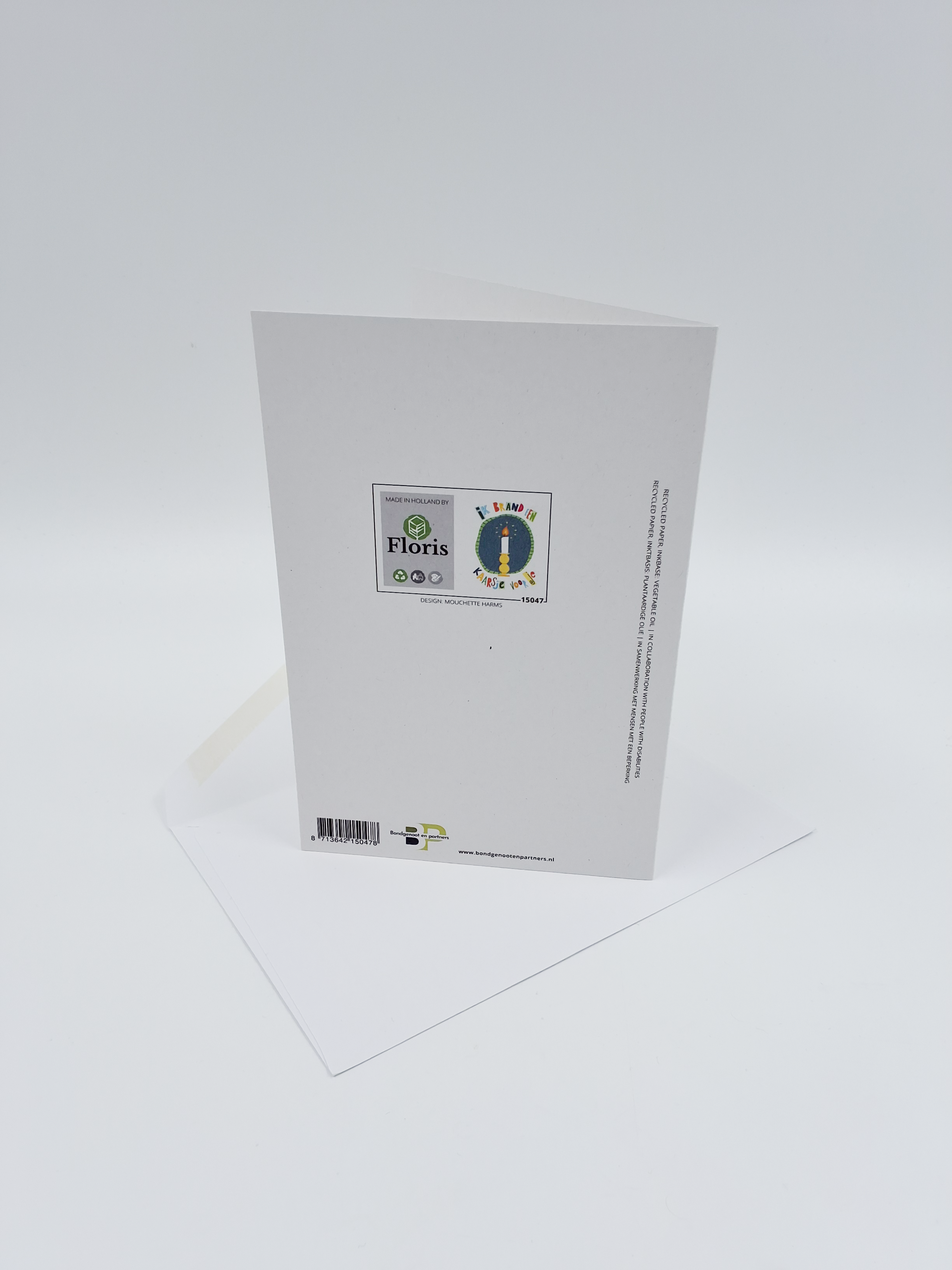 Deze wenskaart is iets groter dan een standaard wenskaart en heeft geen plastiek verpakking. Elke kaart komt met een passende envelop.