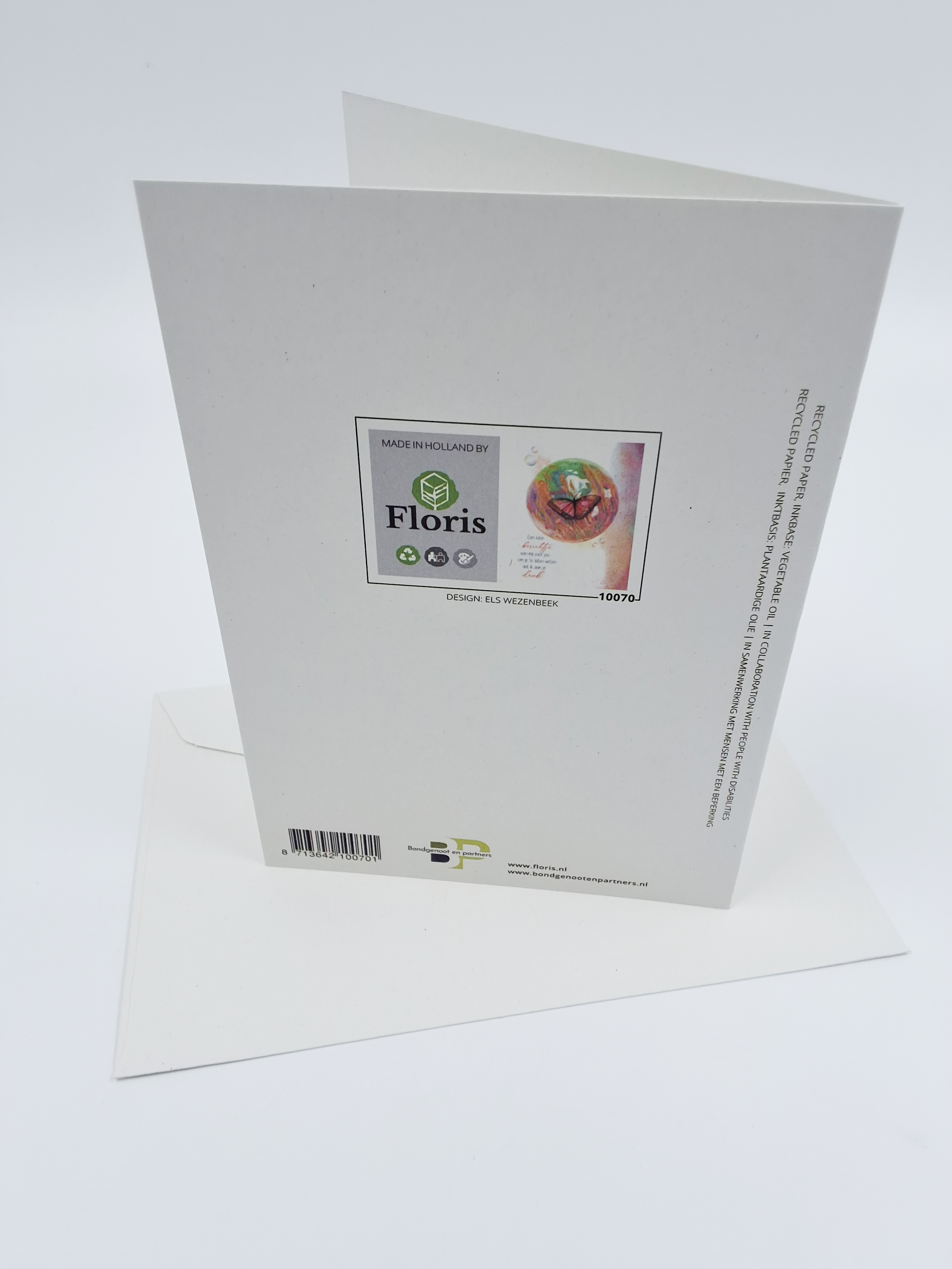 Onze wenskaarten zijn gemaakt van gerecycled papier en bedrukt met inkt op basis van plantaardige olie.