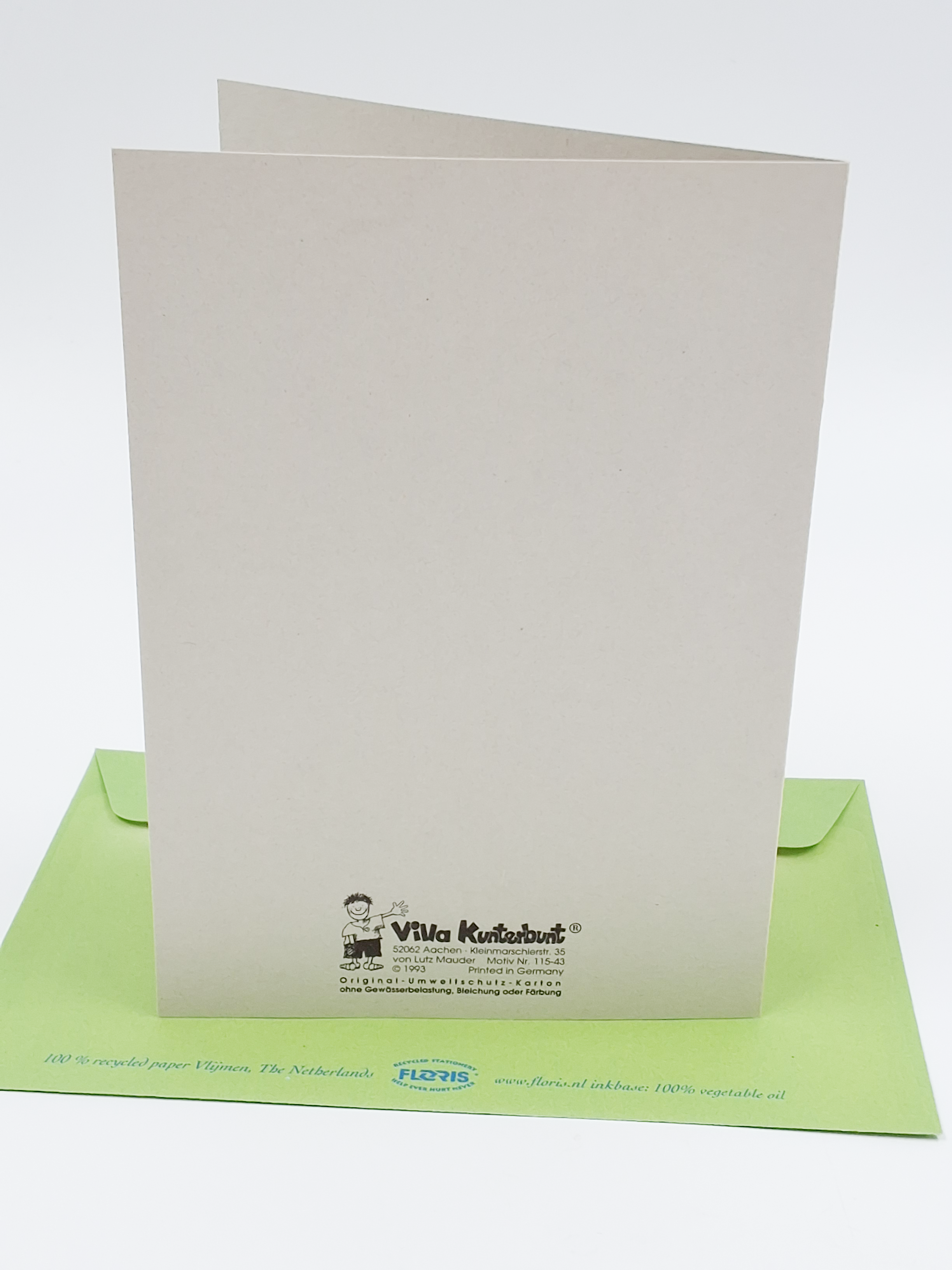 Onze wenskaarten zijn gemaakt van gerecycled papier en bedrukt met inkt op basis van plantaardige olie.