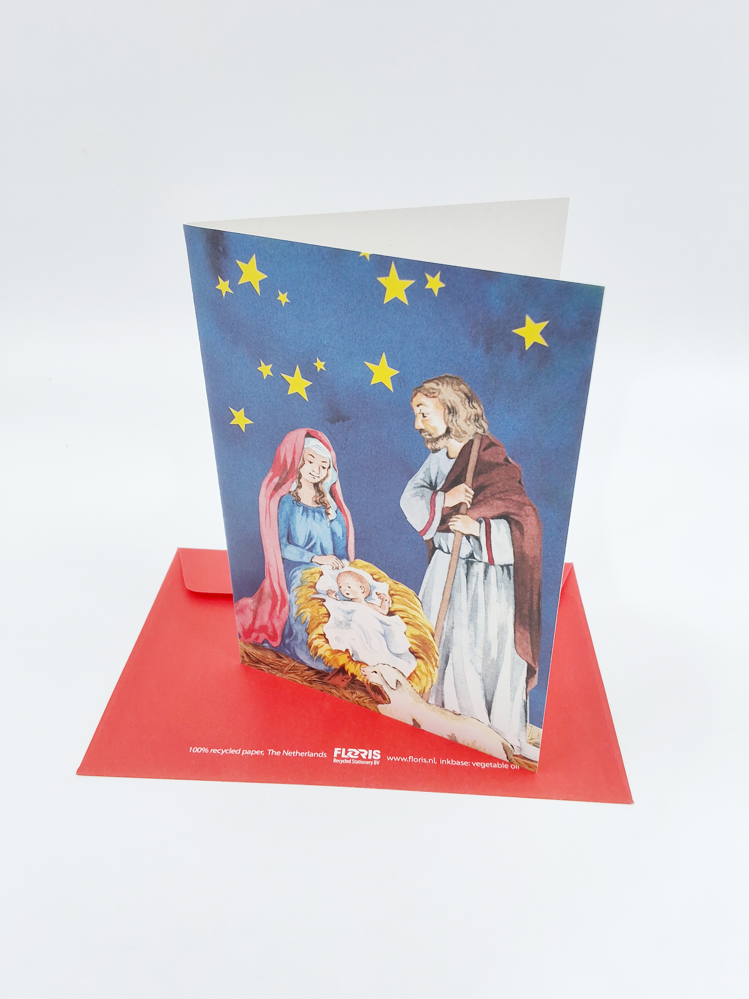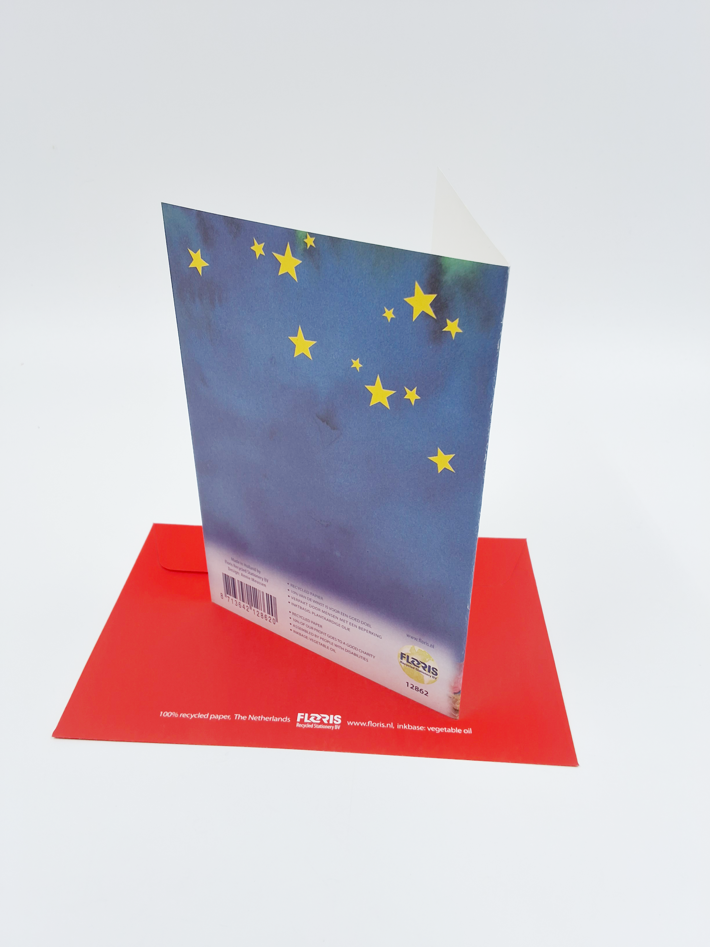 Onze kerstkaarten zijn gemaakt van gerecycled papier en bedrukt met inkt op basis van plantaardige olie.