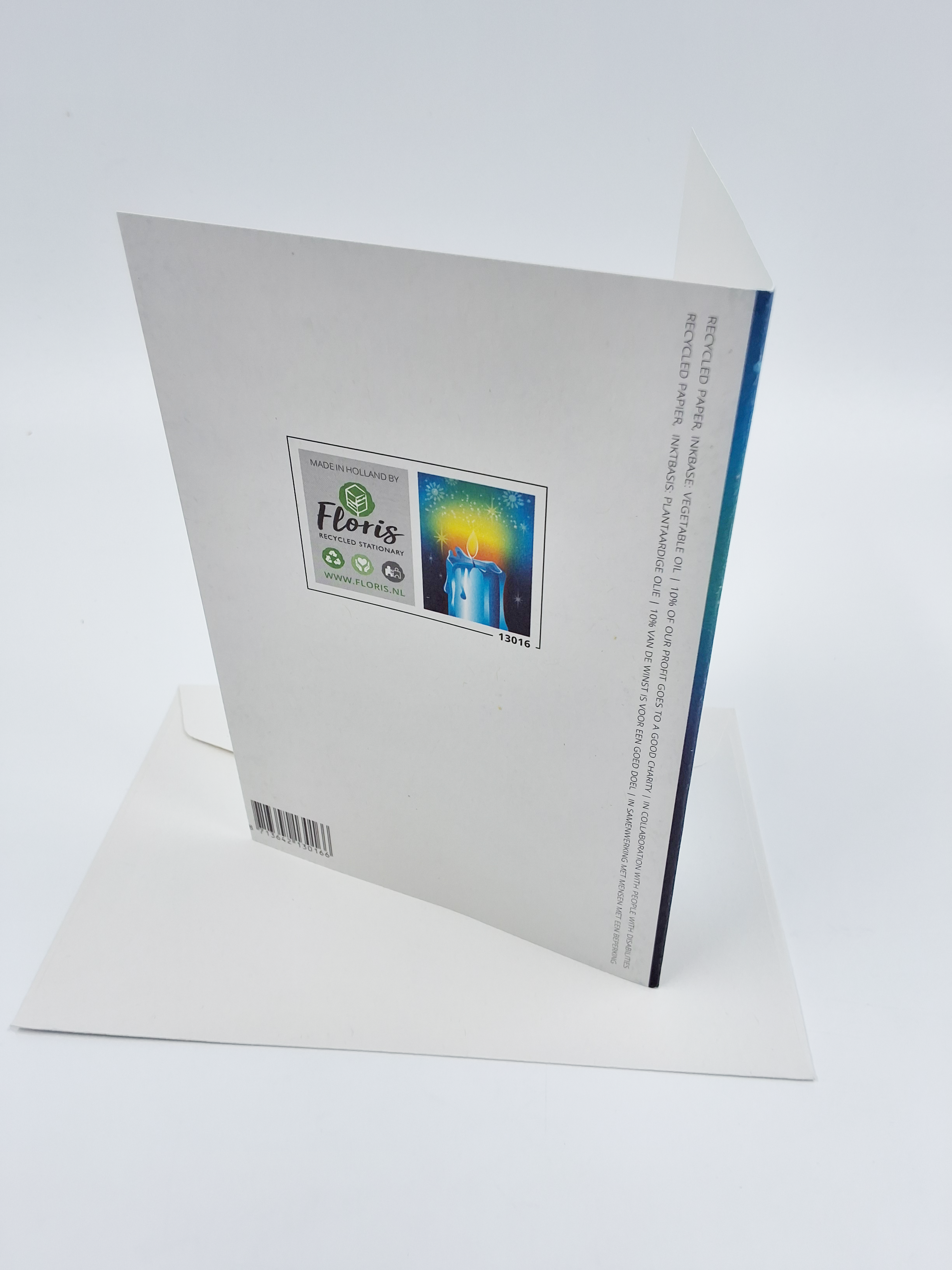 Onze kerstkaarten zijn gemaakt van gerecycled papier en bedrukt met inkt op basis van plantaardige olie.