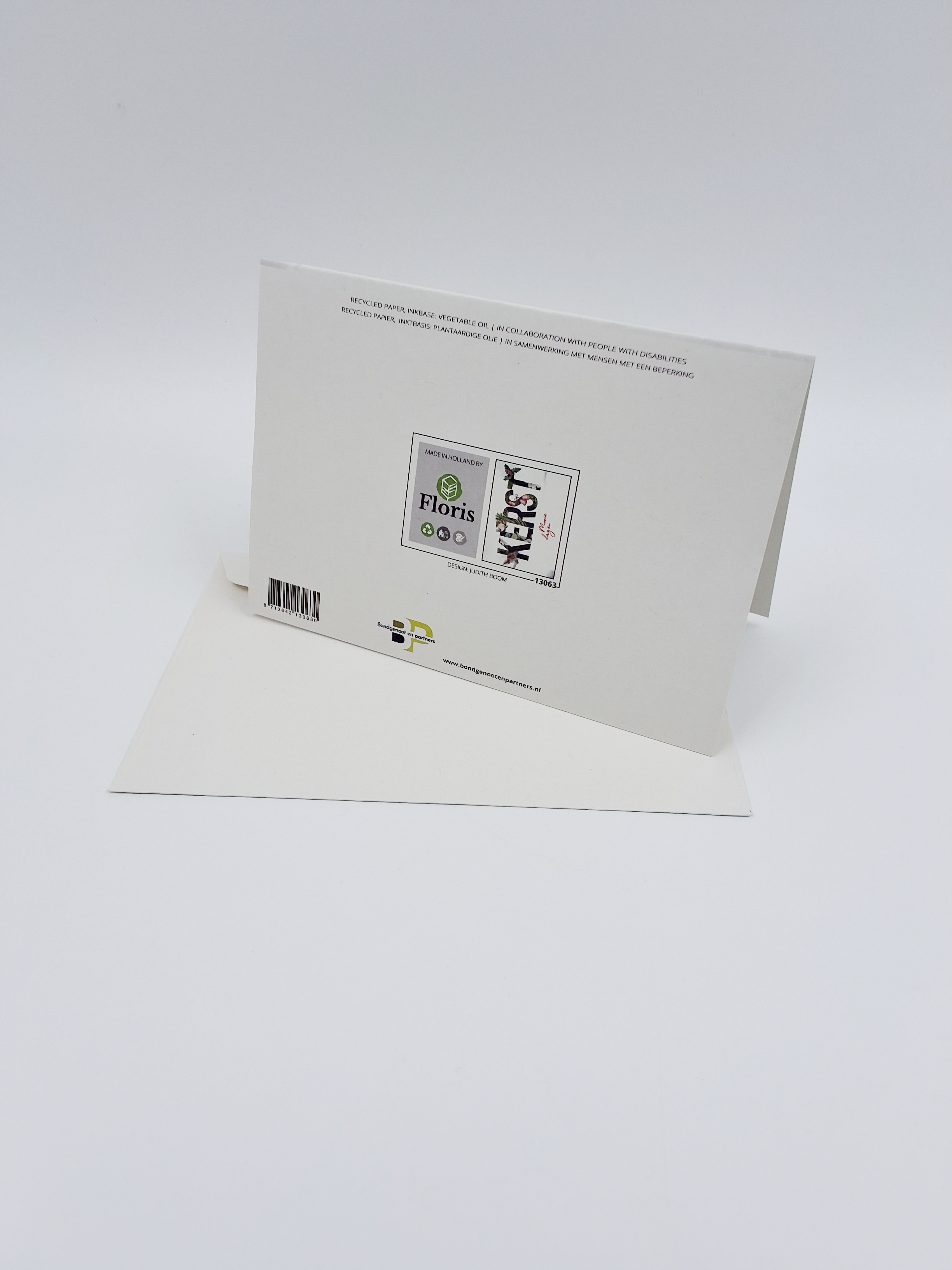 Onze kerstkaarten zijn gemaakt van gerecycled papier en bedrukt met inkt op basis van plantaardige olie.