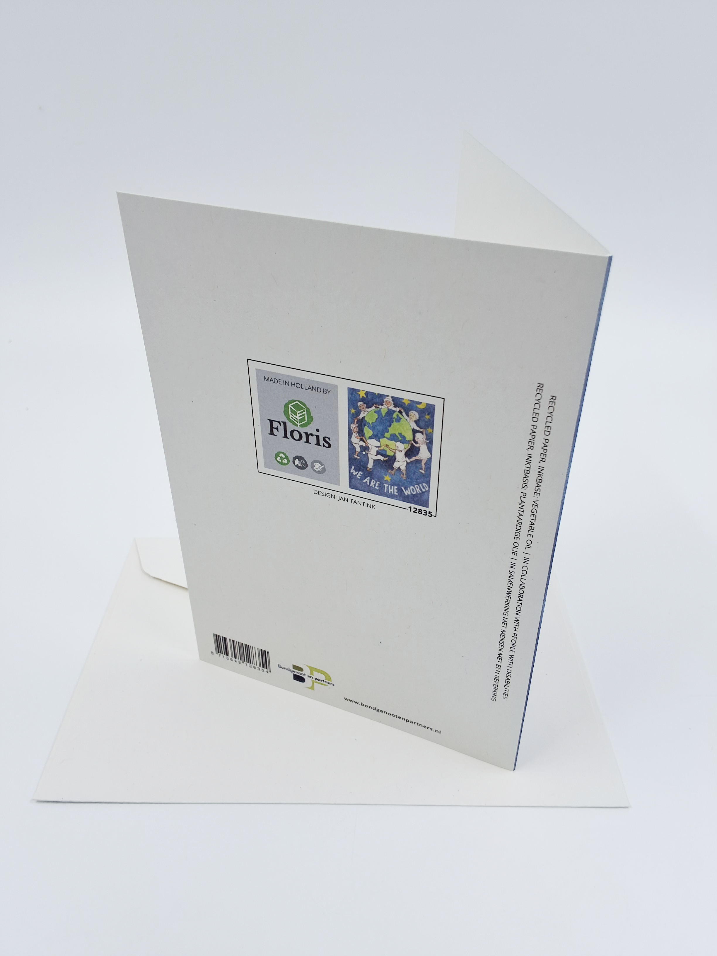 Onze kerstkaarten zijn gemaakt van gerecycled papier en bedrukt met inkt op basis van plantaardige olie.