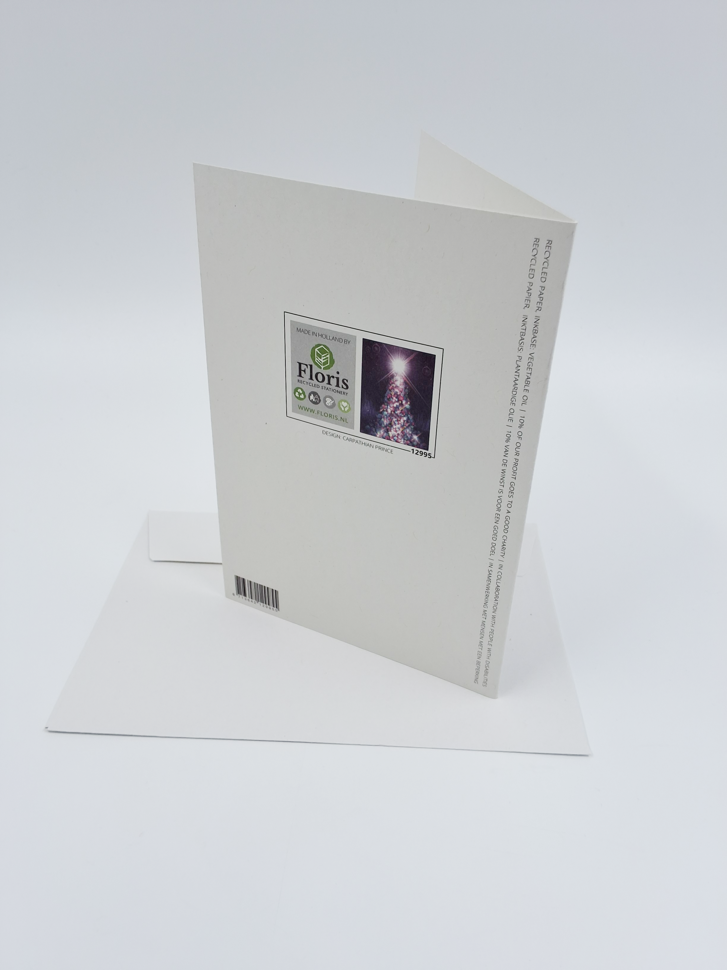 Onze kerstkaarten zijn gemaakt van gerecycled papier en bedrukt met inkt op basis van plantaardige olie.