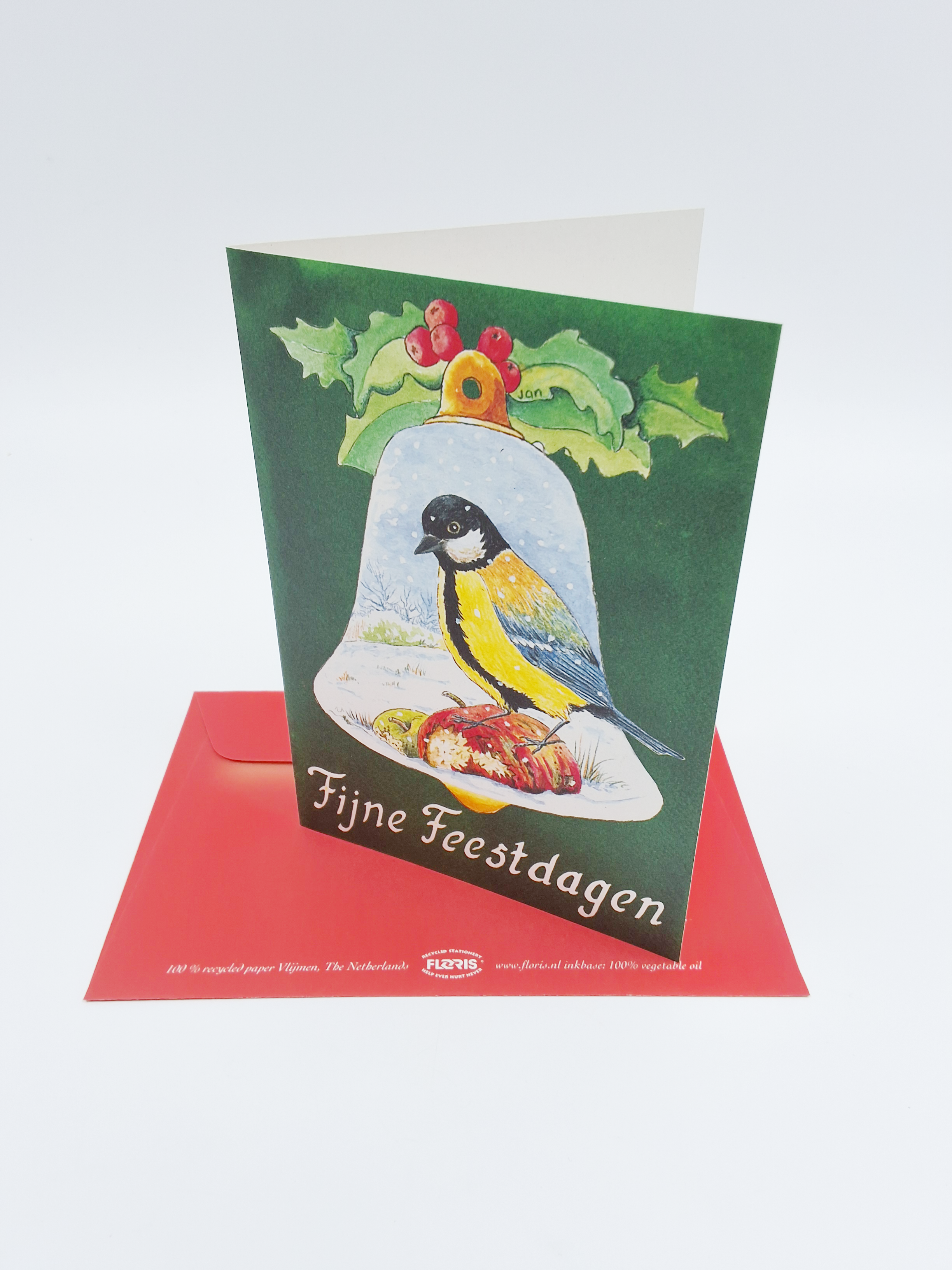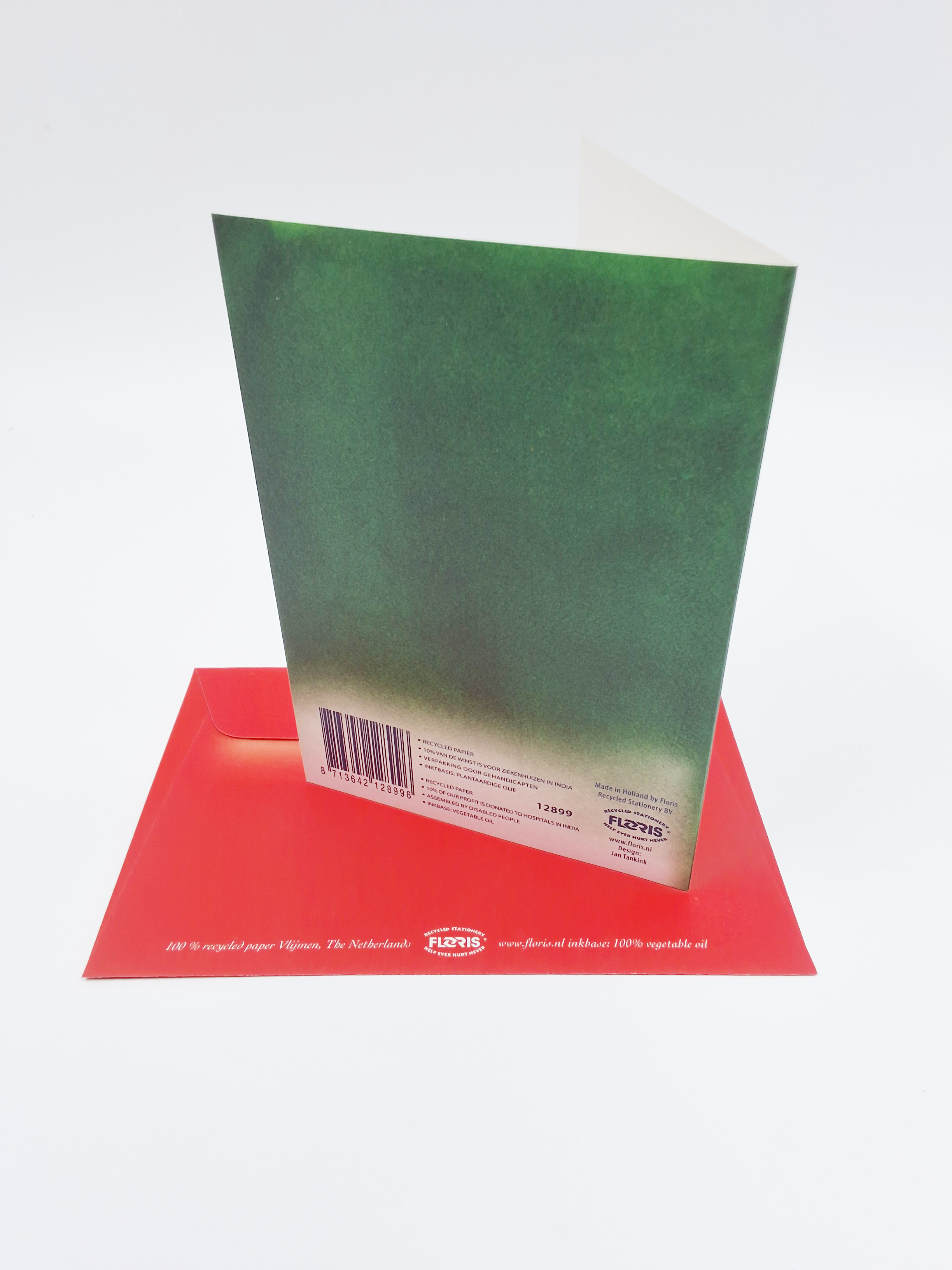 Onze kerstkaarten zijn gemaakt van gerecycled papier en bedrukt met inkt op basis van plantaardige olie.