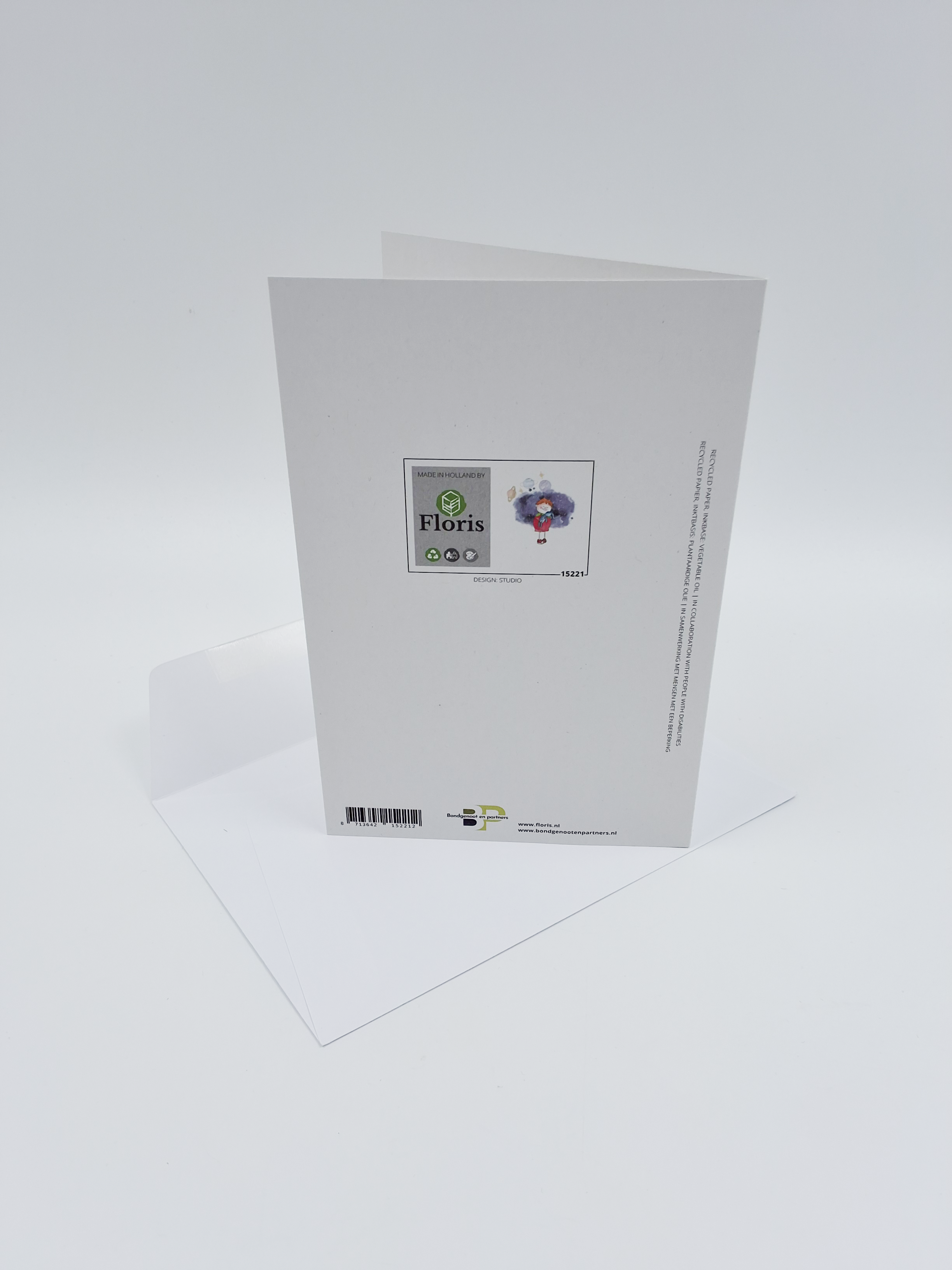 Deze wenskaart is iets groter dan een standaard wenskaart en heeft geen plastiek verpakking. Elke kaart komt met een passende envelop.