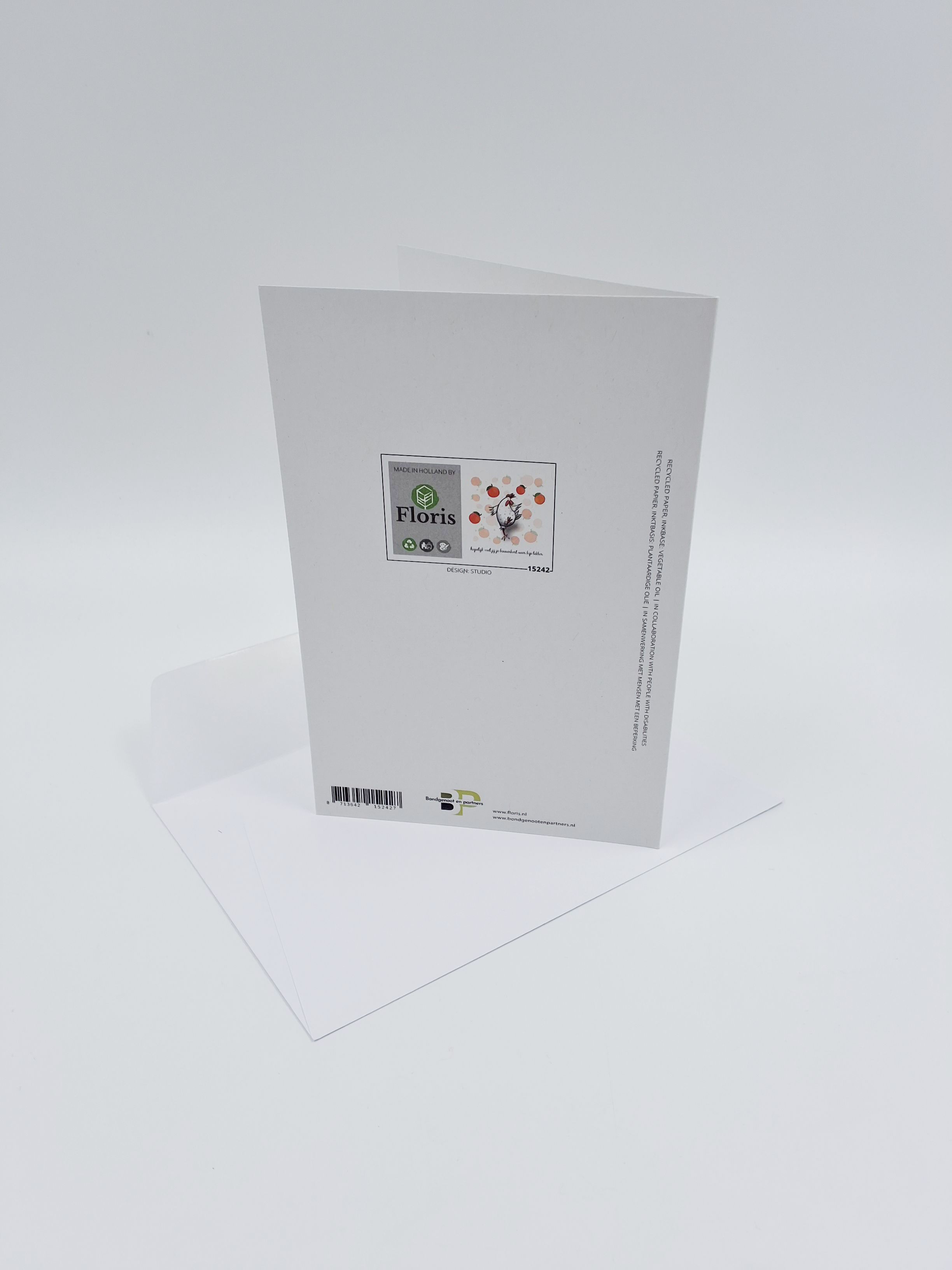 Deze wenskaart is iets groter dan een standaard wenskaart en heeft geen plastiek verpakking. Elke kaart komt met een passende envelop.