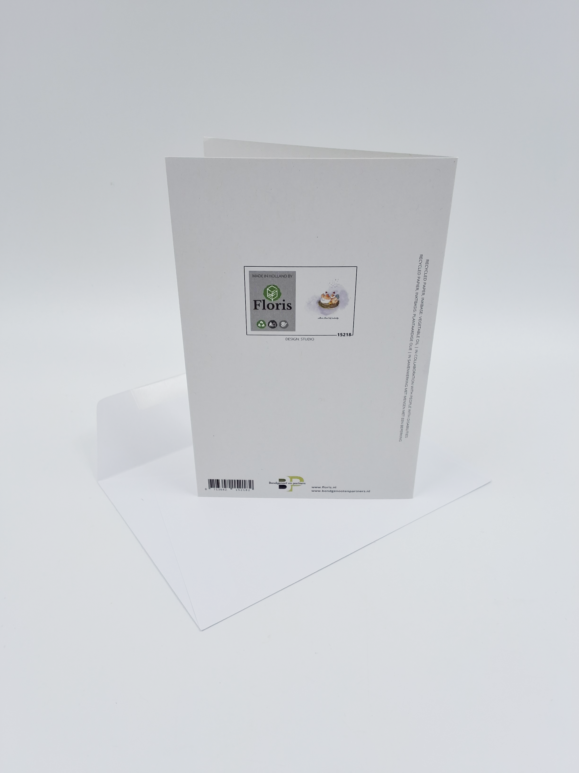 Deze wenskaart is iets groter dan een standaard wenskaart en heeft geen plastiek verpakking. Elke kaart komt met een passende envelop.