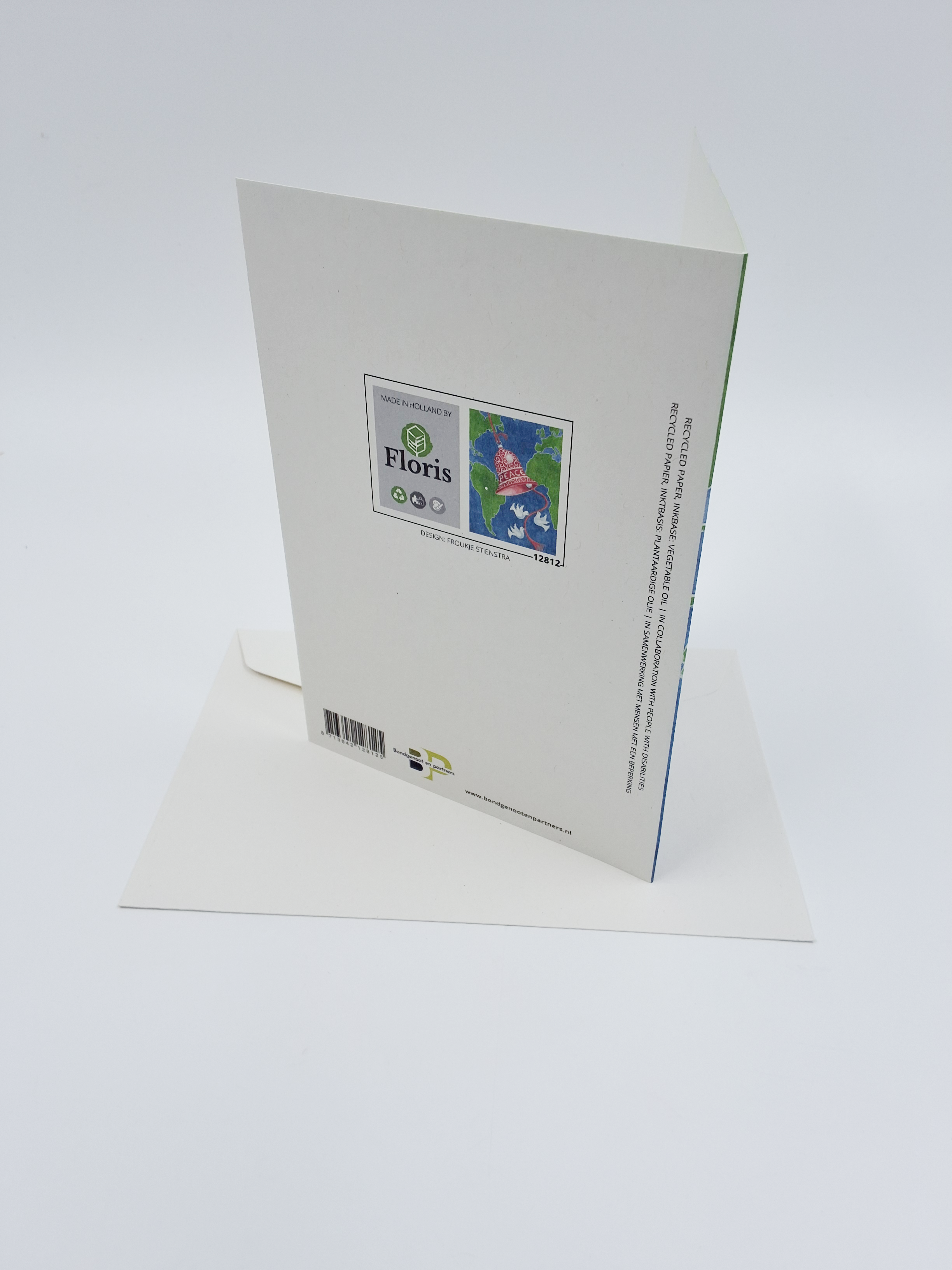 Onze kerstkaarten zijn gemaakt van gerecycled papier en bedrukt met inkt op basis van plantaardige olie.