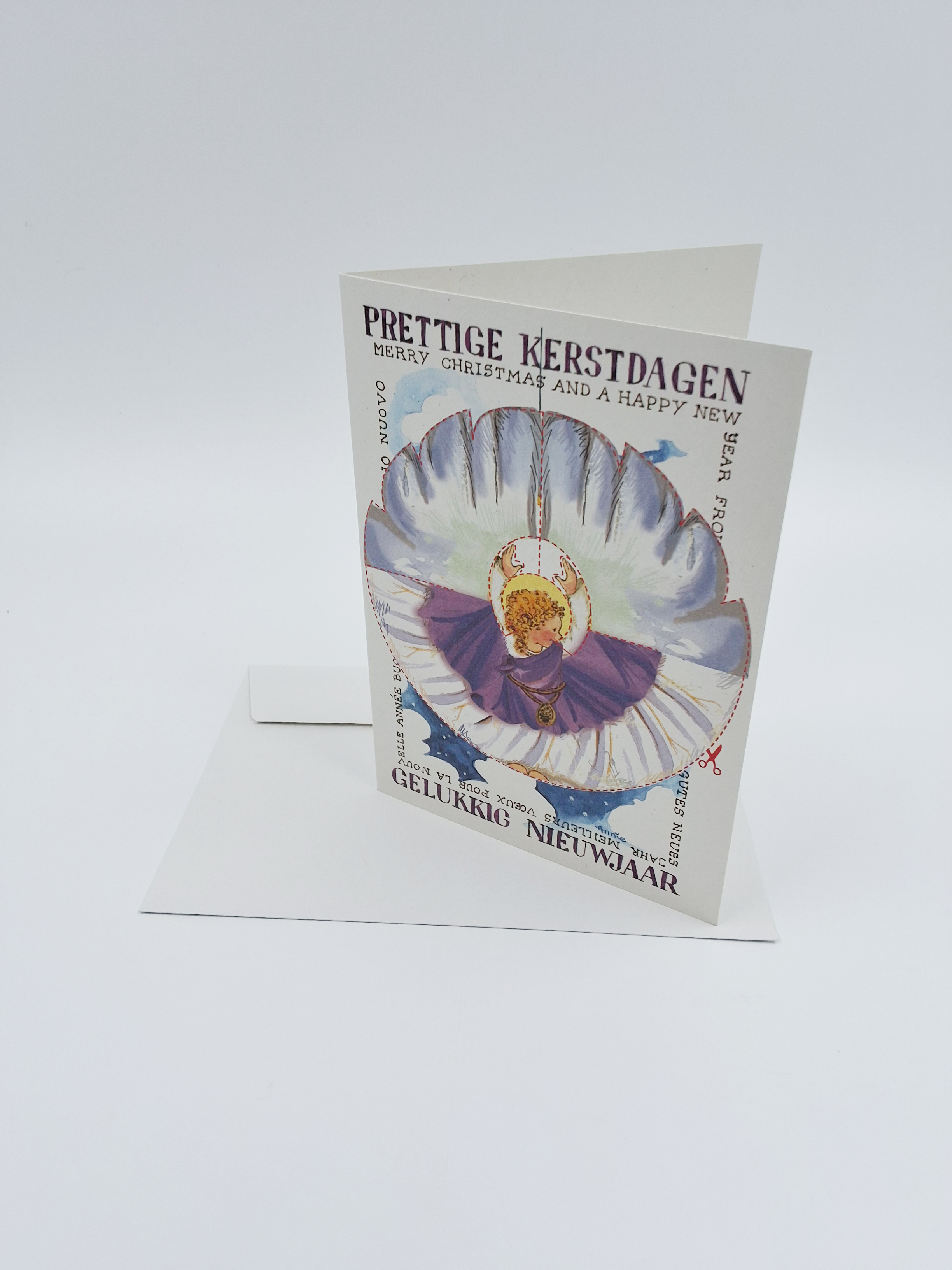 Wenskaart knipkaart engel paars "prettige kerst"