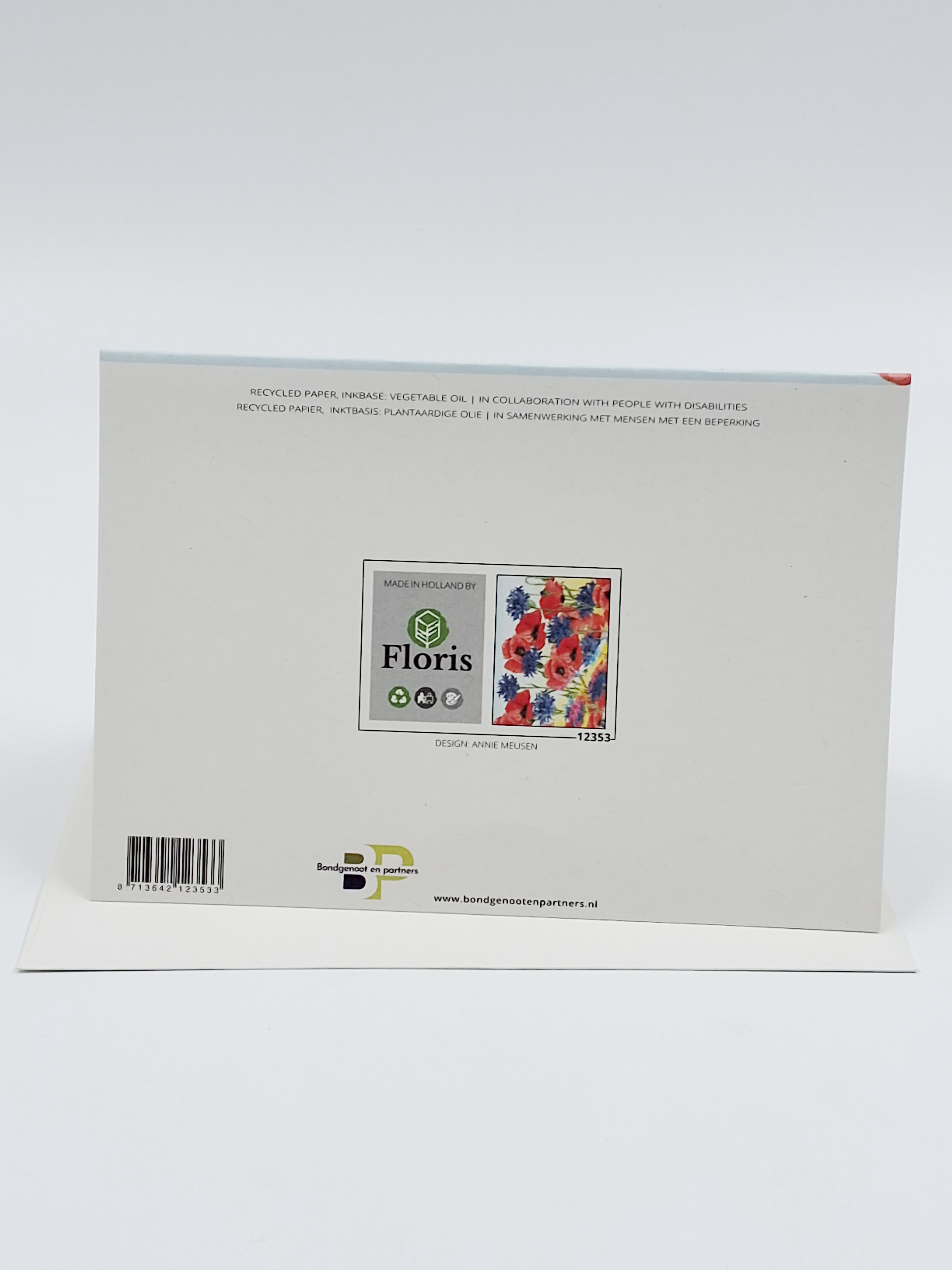 Onze wenskaarten zijn gemaakt van gerecycled papier en bedrukt met inkt op basis van plantaardige olie.