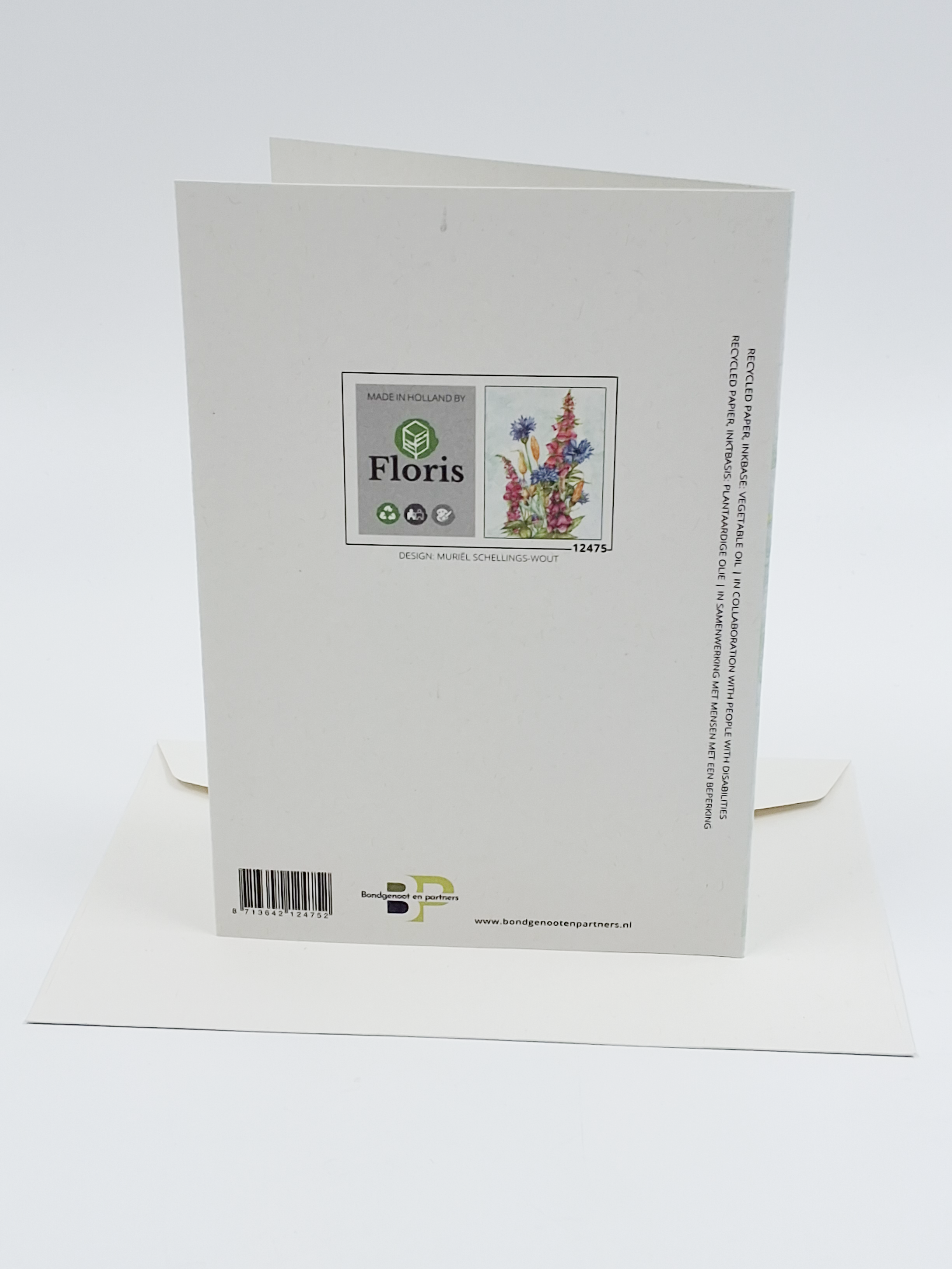 Onze wenskaarten zijn gemaakt van gerecycled papier en bedrukt met inkt op basis van plantaardige olie.