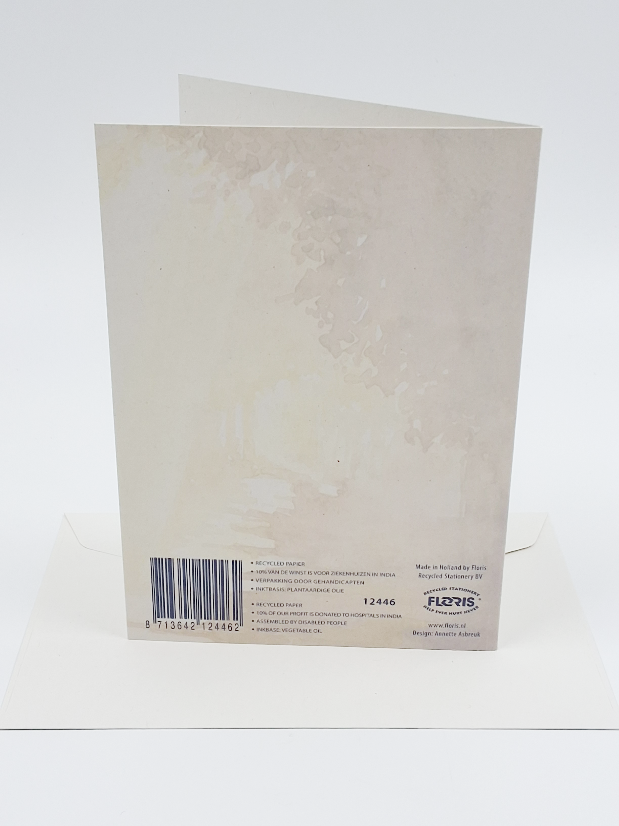 Onze wenskaarten zijn gemaakt van gerecycled papier en bedrukt met inkt op basis van plantaardige olie.