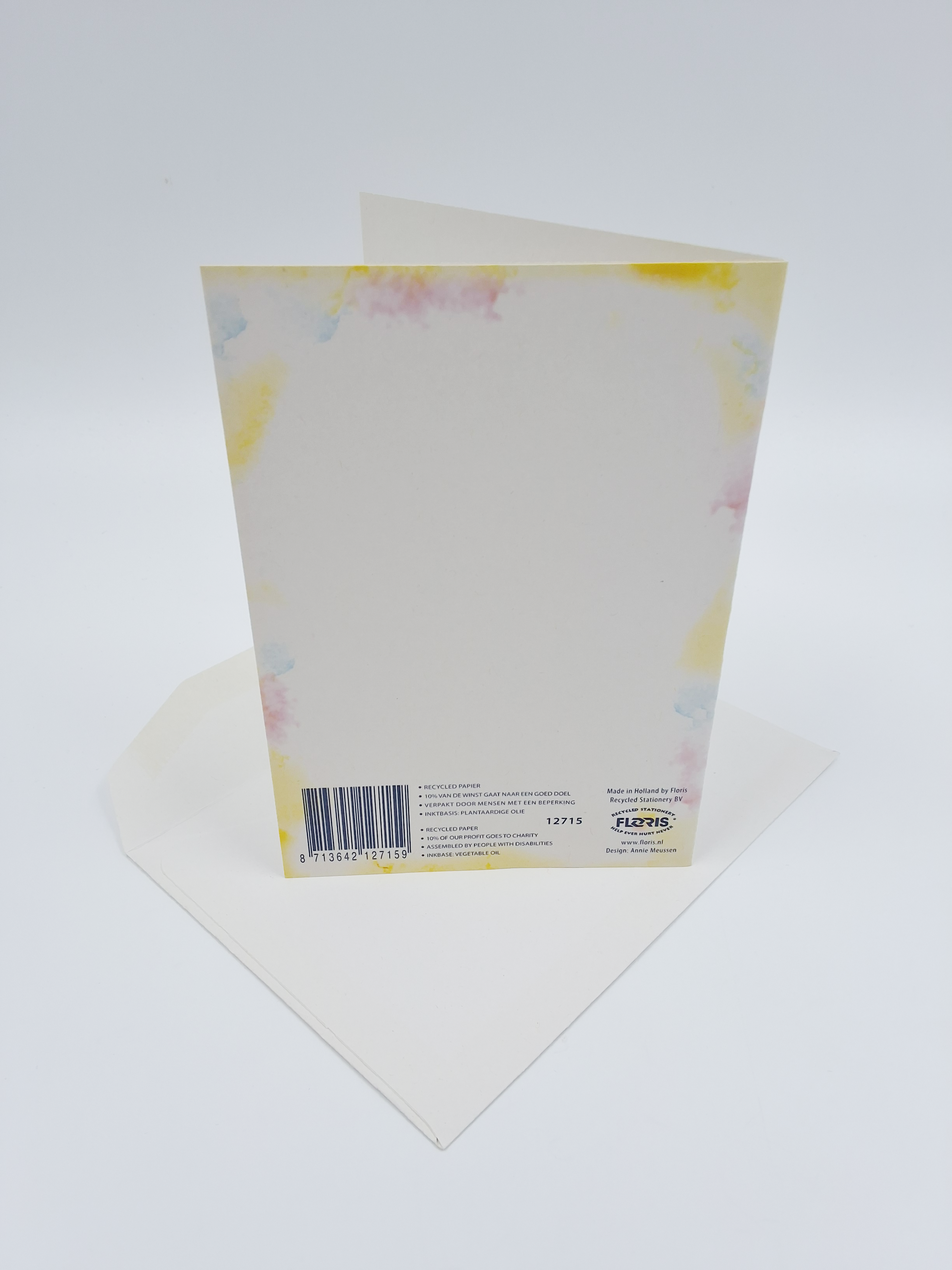 Onze wenskaarten zijn gemaakt van gerecycled papier en bedrukt met inkt op basis van plantaardige olie.