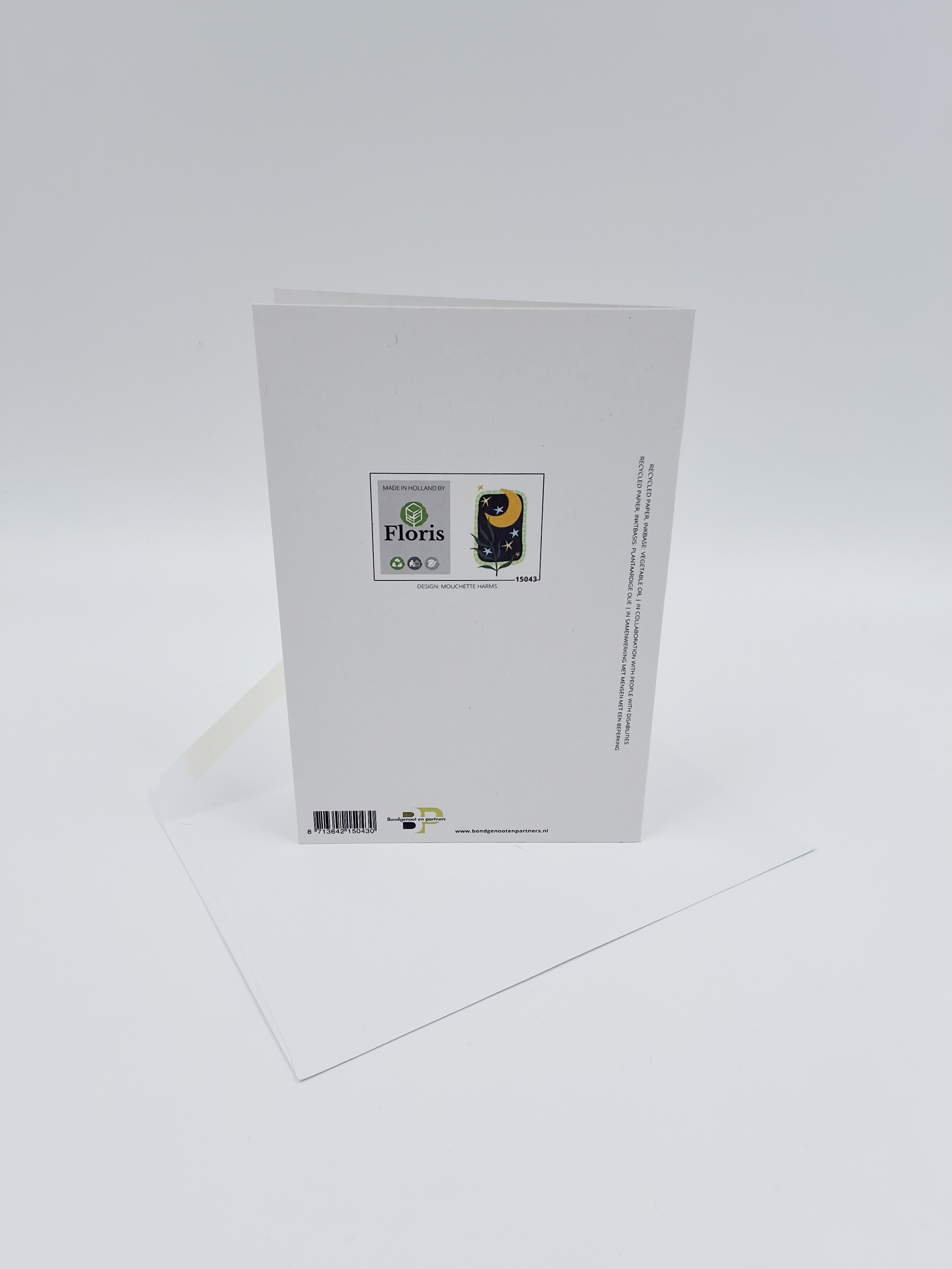 Deze wenskaart is iets groter dan een standaard wenskaart en heeft geen plastiek verpakking. Elke kaart komt met een passende envelop.