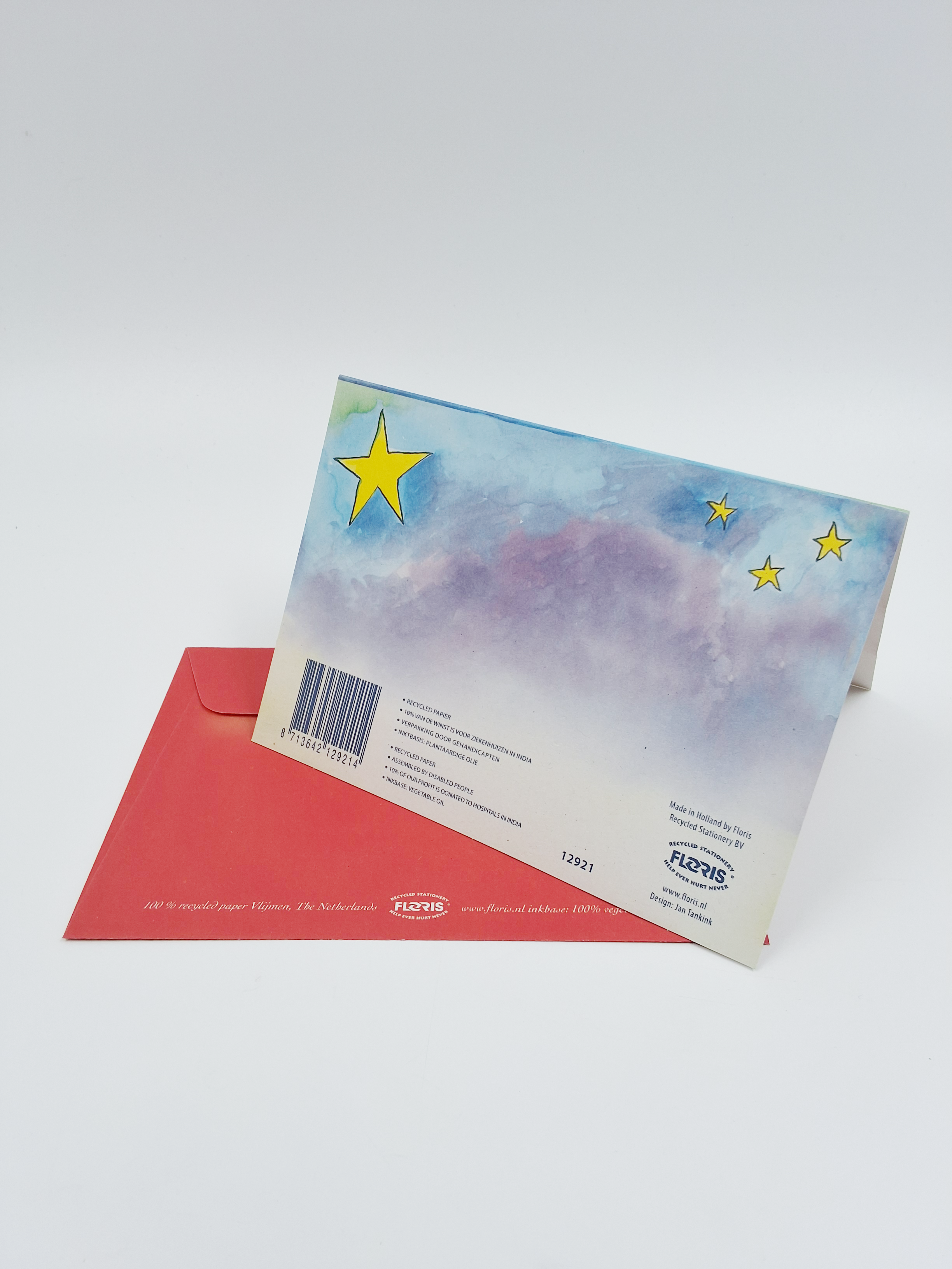 Onze kerstkaarten zijn gemaakt van gerecycled papier en bedrukt met inkt op basis van plantaardige olie.