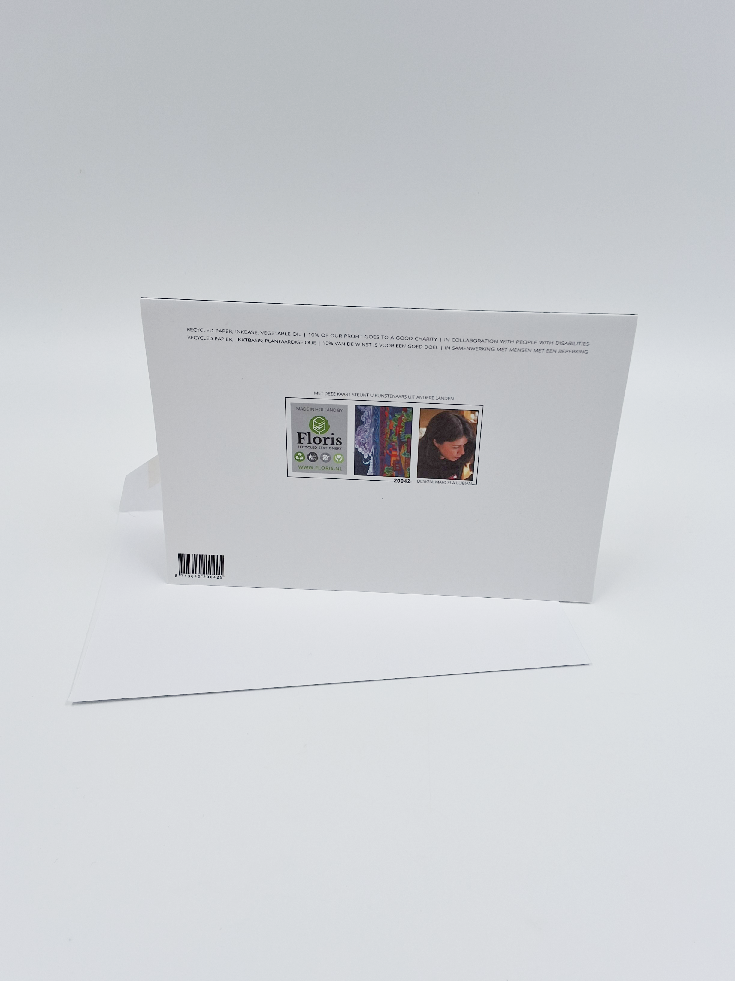 Onze wenskaarten zijn gemaakt van gerecycled papier en bedrukt met inkt op basis van plantaardige olie.