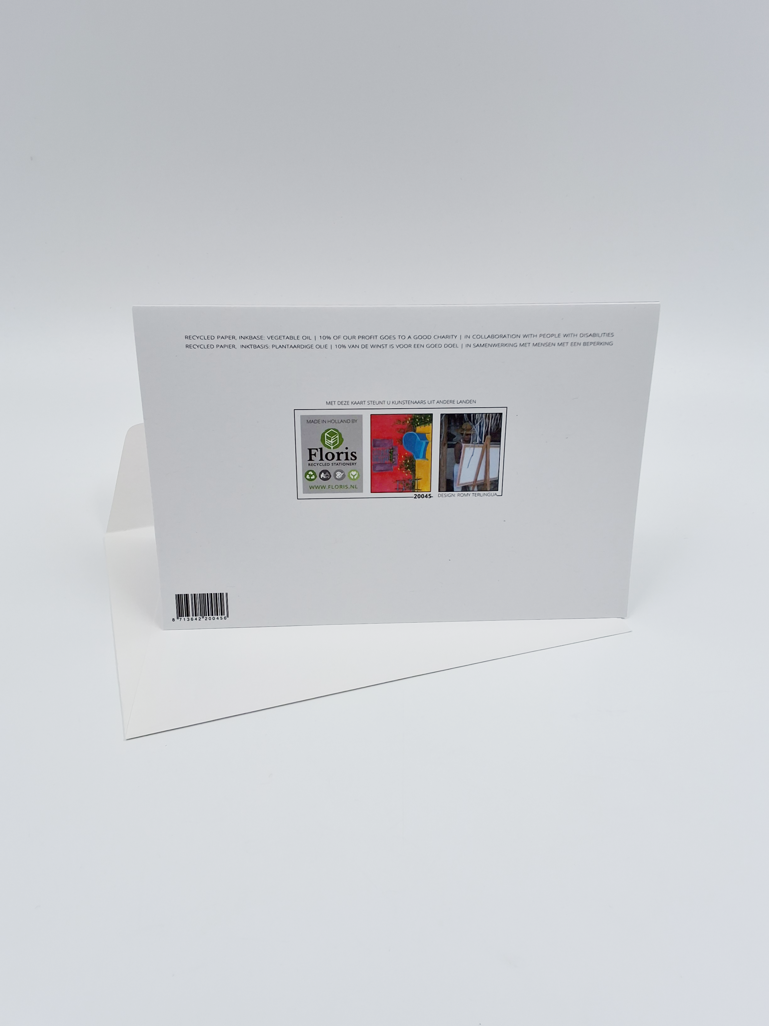 Onze wenskaarten zijn gemaakt van gerecycled papier en bedrukt met inkt op basis van plantaardige olie.