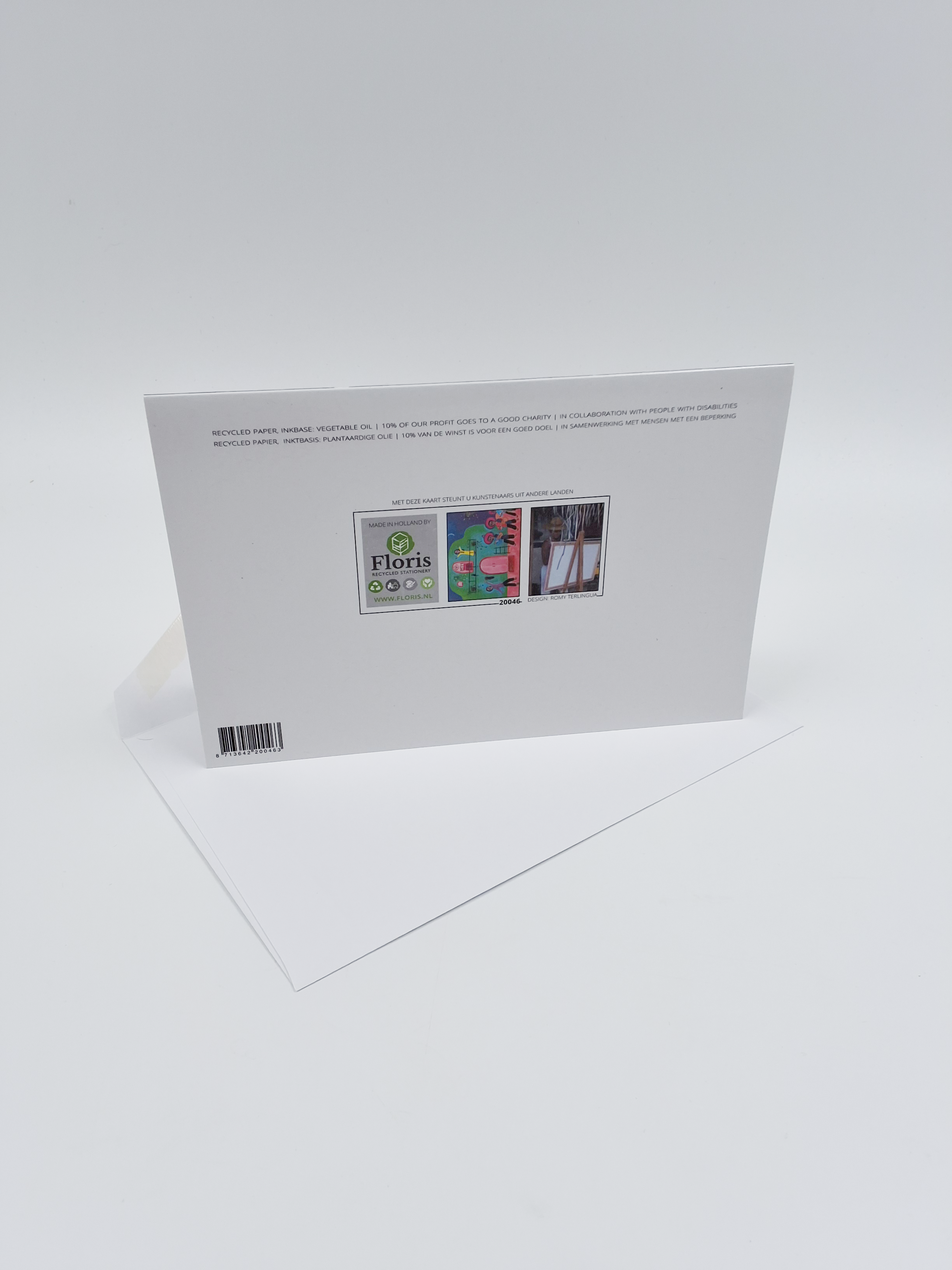Onze wenskaarten zijn gemaakt van gerecycled papier en bedrukt met inkt op basis van plantaardige olie.