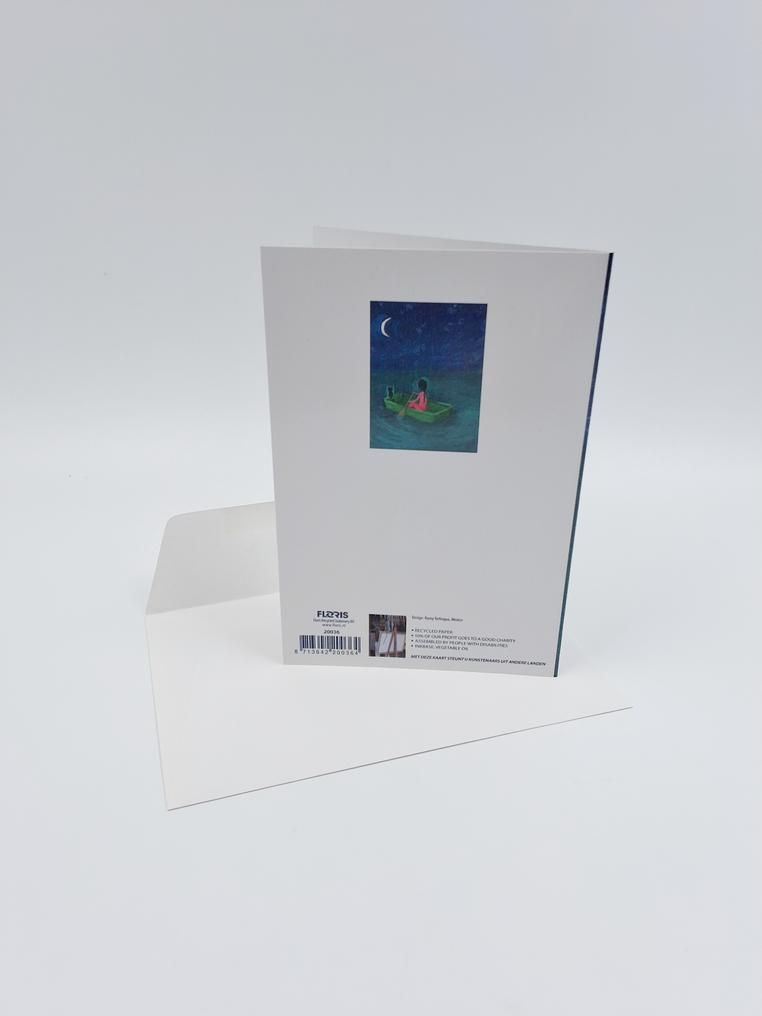 Onze wenskaarten zijn gemaakt van gerecycled papier en bedrukt met inkt op basis van plantaardige olie.