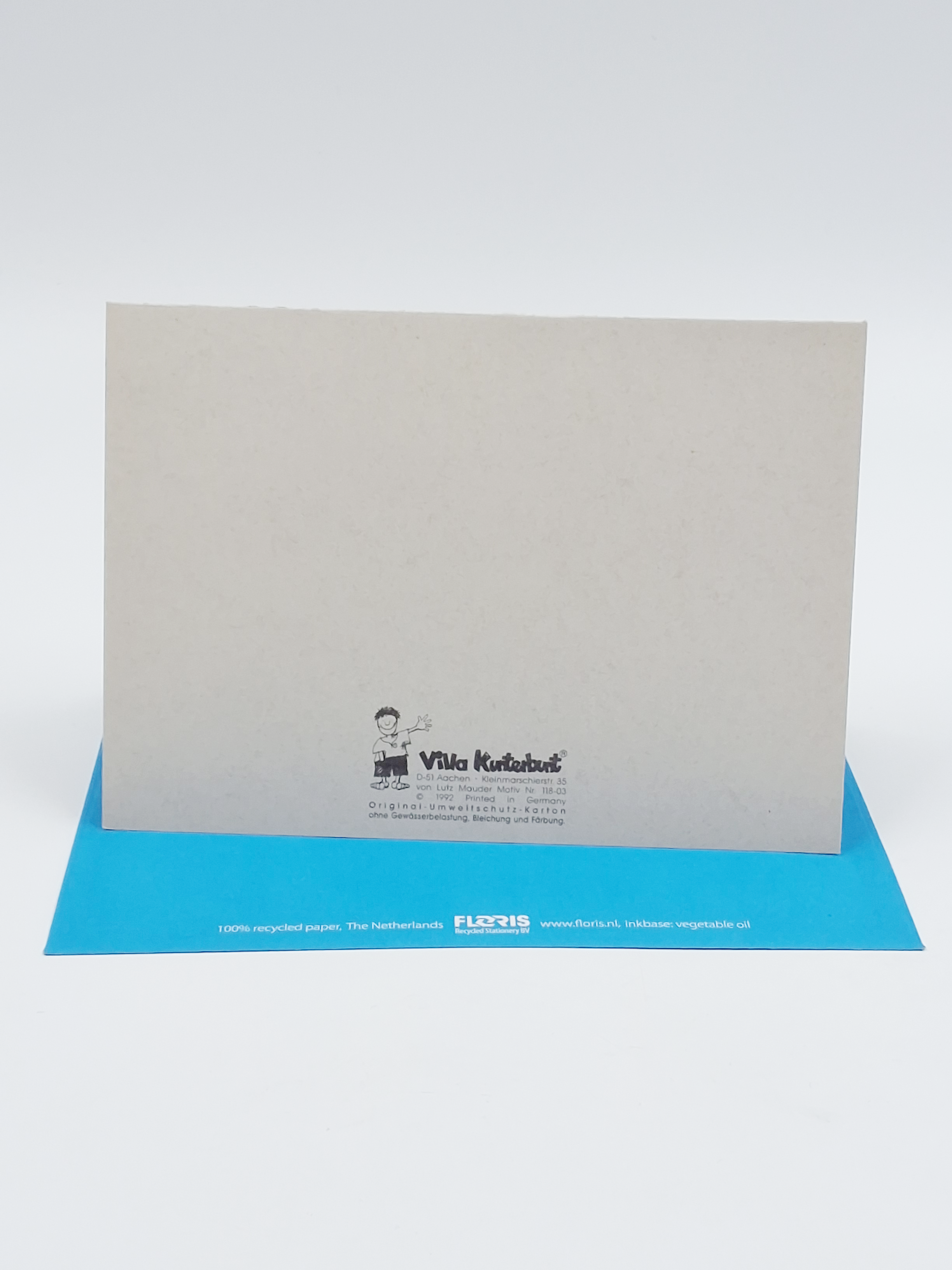 Onze wenskaarten zijn gemaakt van gerecycled papier en bedrukt met inkt op basis van plantaardige olie.