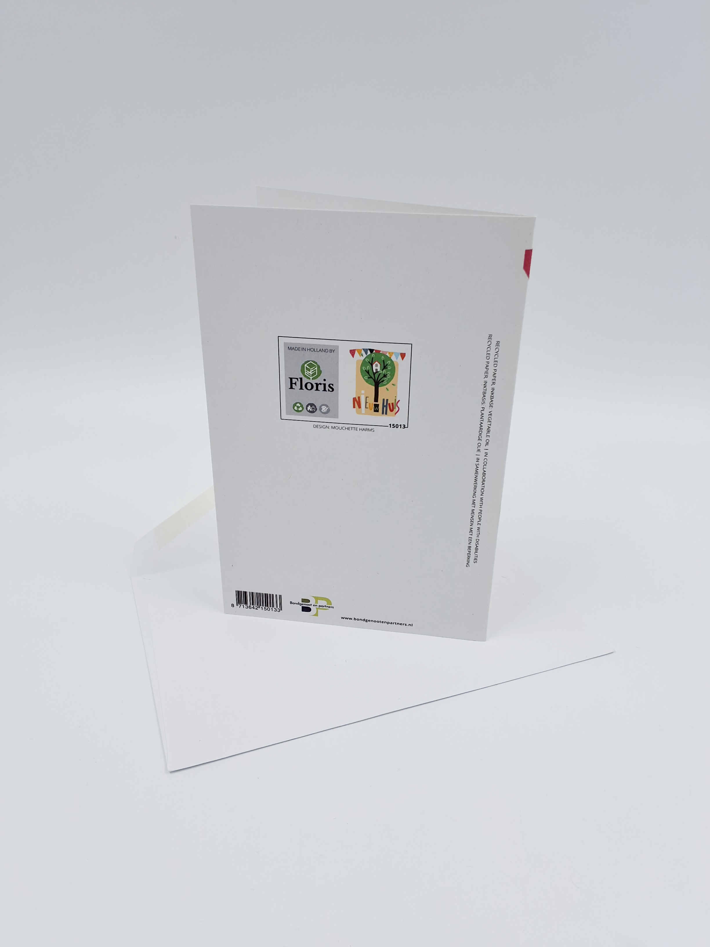 Onze wenskaarten zijn gemaakt van gerecycled papier en bedrukt met inkt op basis van plantaardige olie.