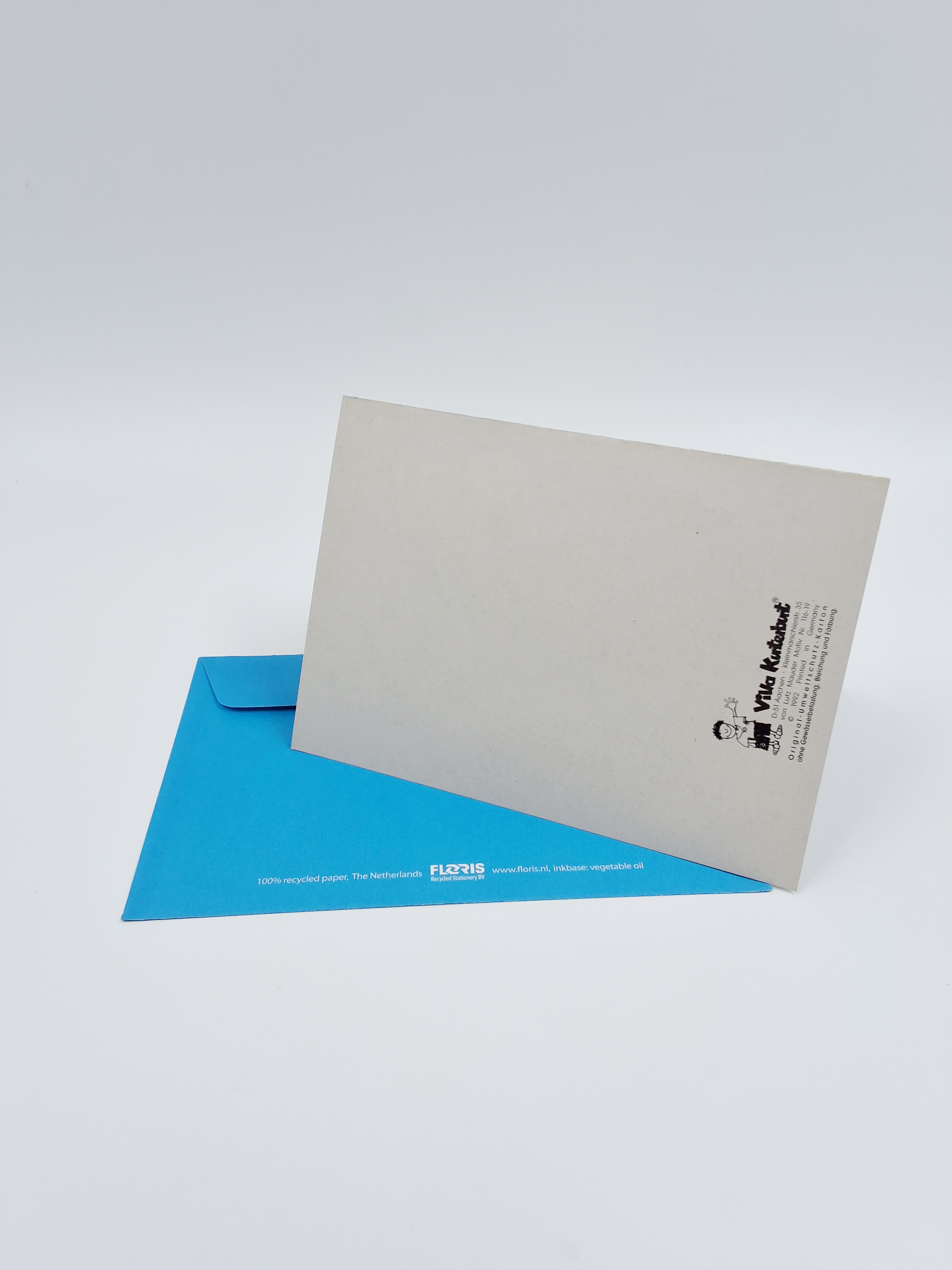 Onze wenskaarten zijn gemaakt van gerecycled papier en bedrukt met inkt op basis van plantaardige olie.