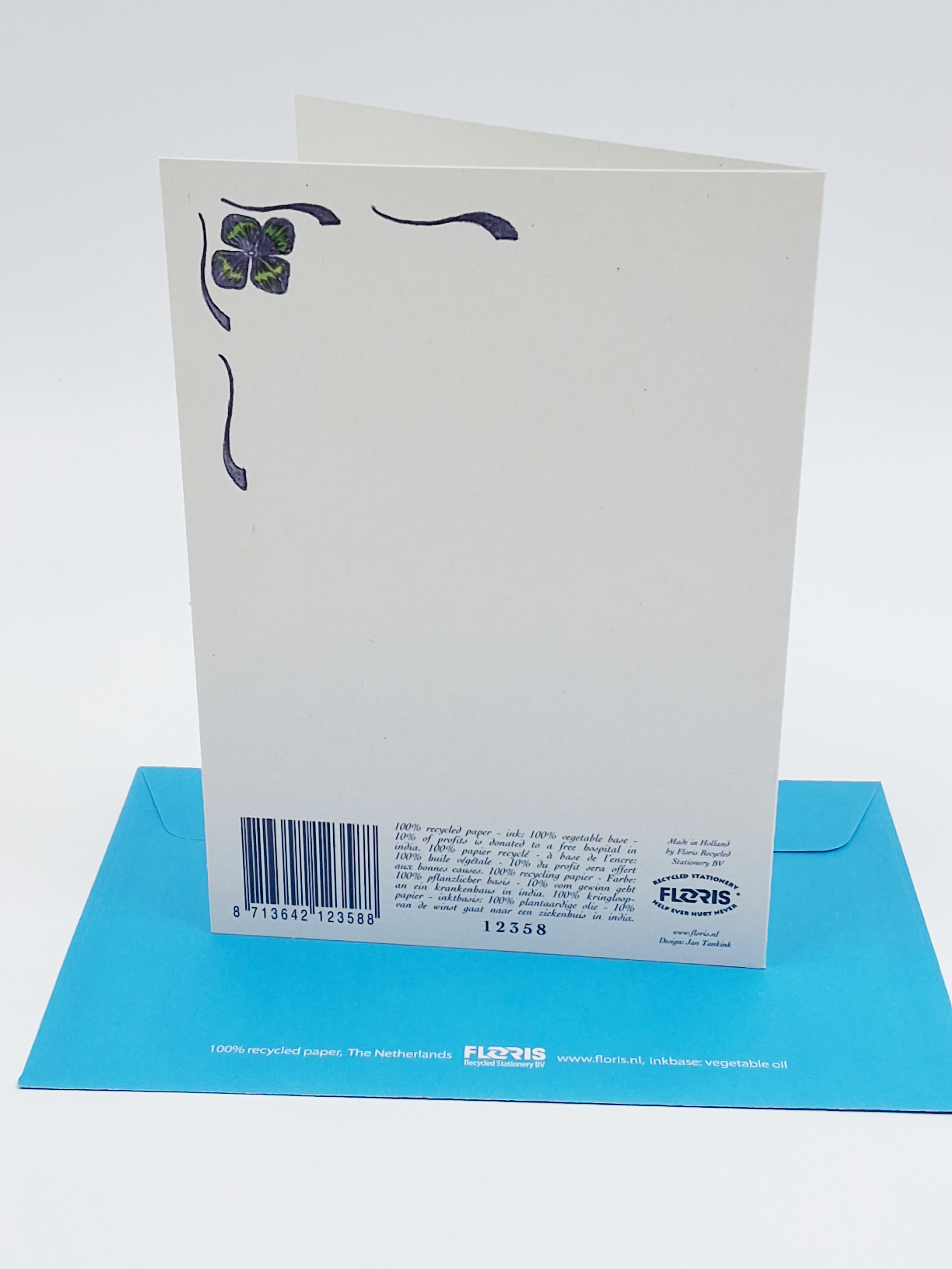 Onze wenskaarten zijn gemaakt van gerecycled papier en bedrukt met inkt op basis van plantaardige olie.