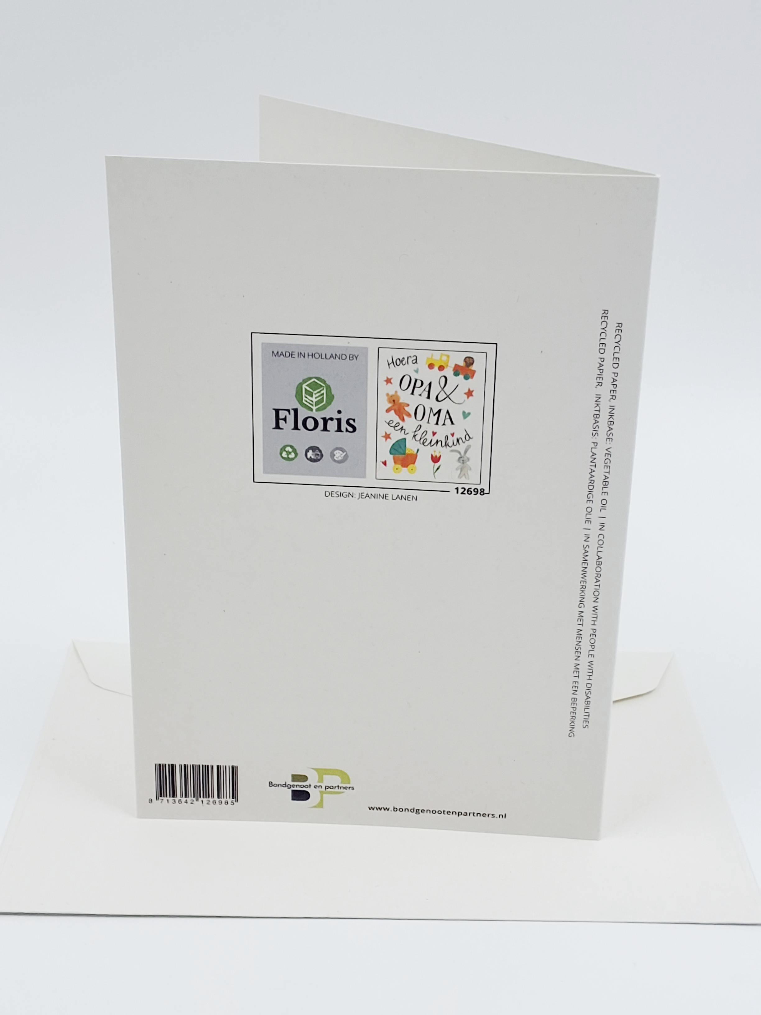 Onze wenskaarten zijn gemaakt van gerecycled papier en bedrukt met inkt op basis van plantaardige olie.