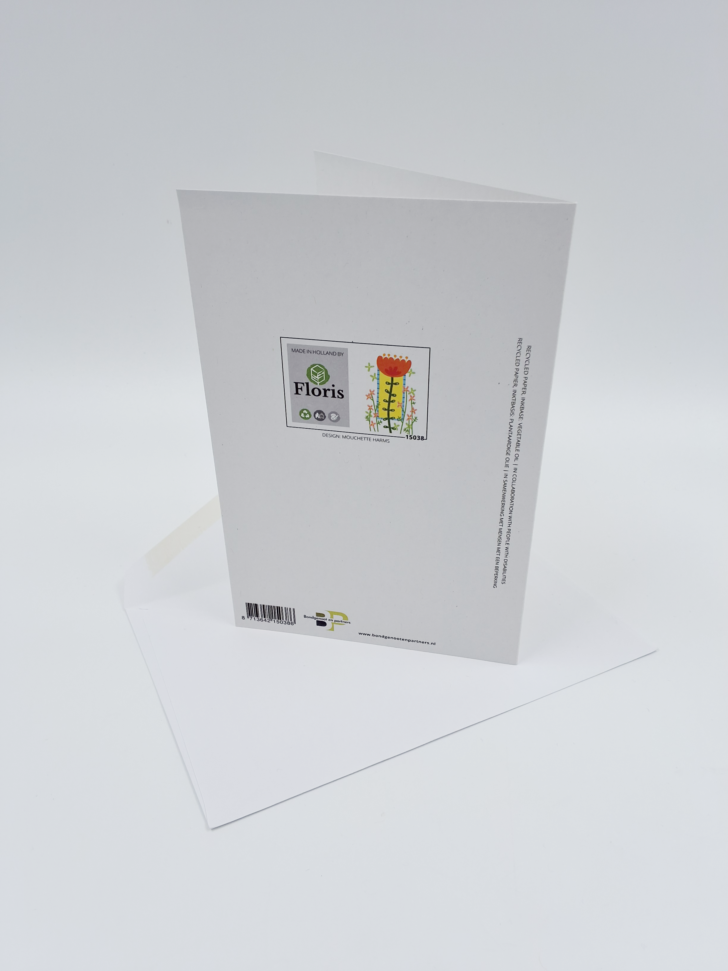 Deze wenskaart is iets groter dan een standaard wenskaart en heeft geen plastiek verpakking. Elke kaart komt met een passende envelop.