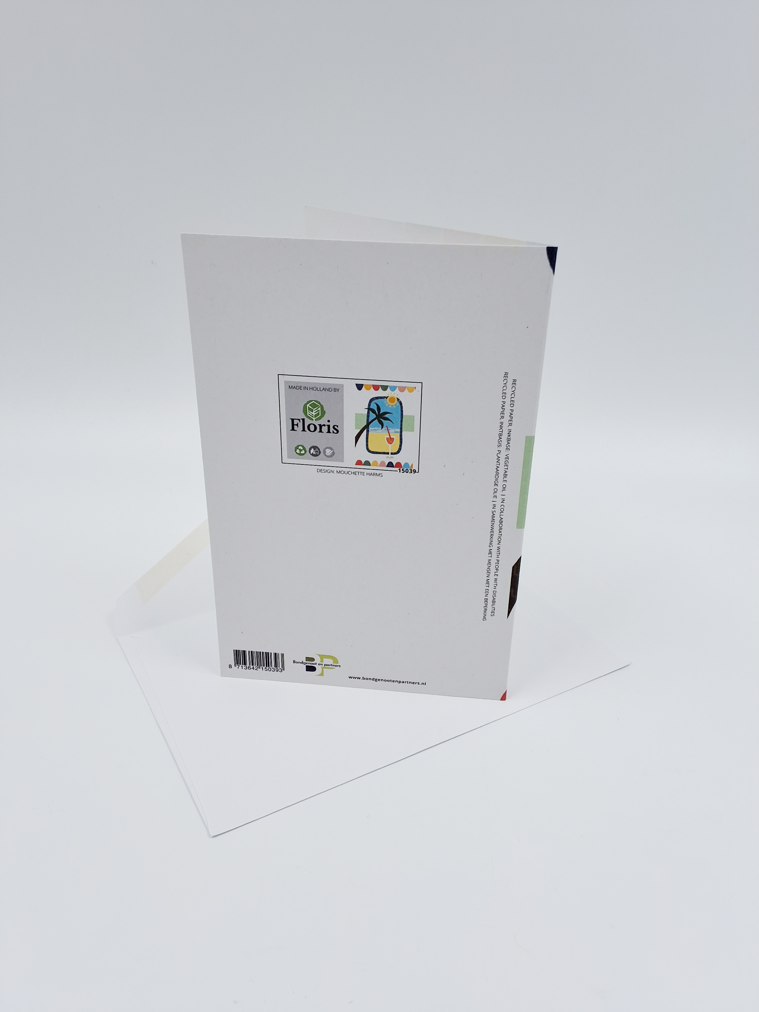 Onze wenskaarten zijn gemaakt van gerecycled papier en bedrukt met inkt op basis van plantaardige olie.