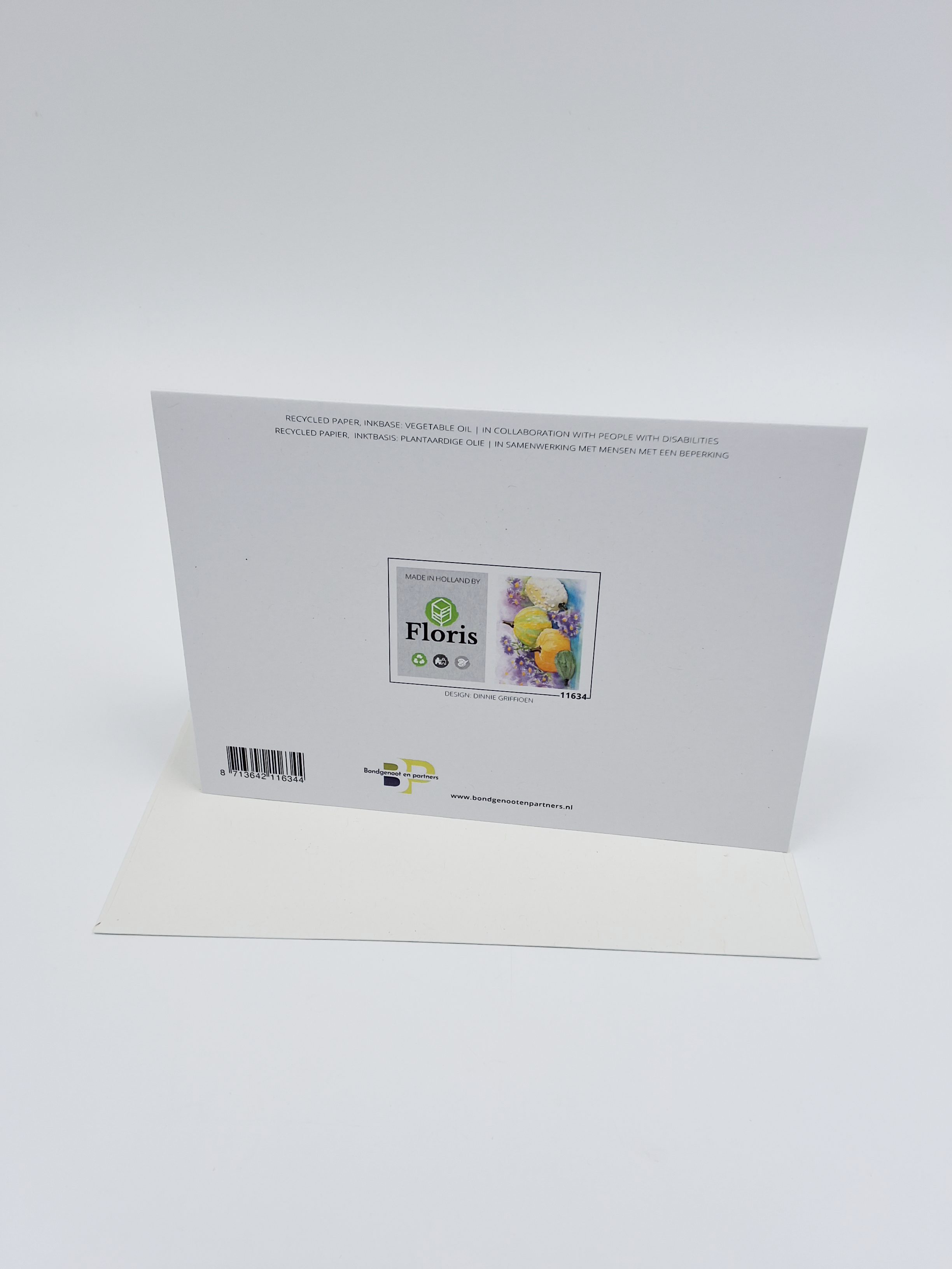 Onze wenskaarten zijn gemaakt van gerecycled papier en bedrukt met inkt op basis van plantaardige olie.
