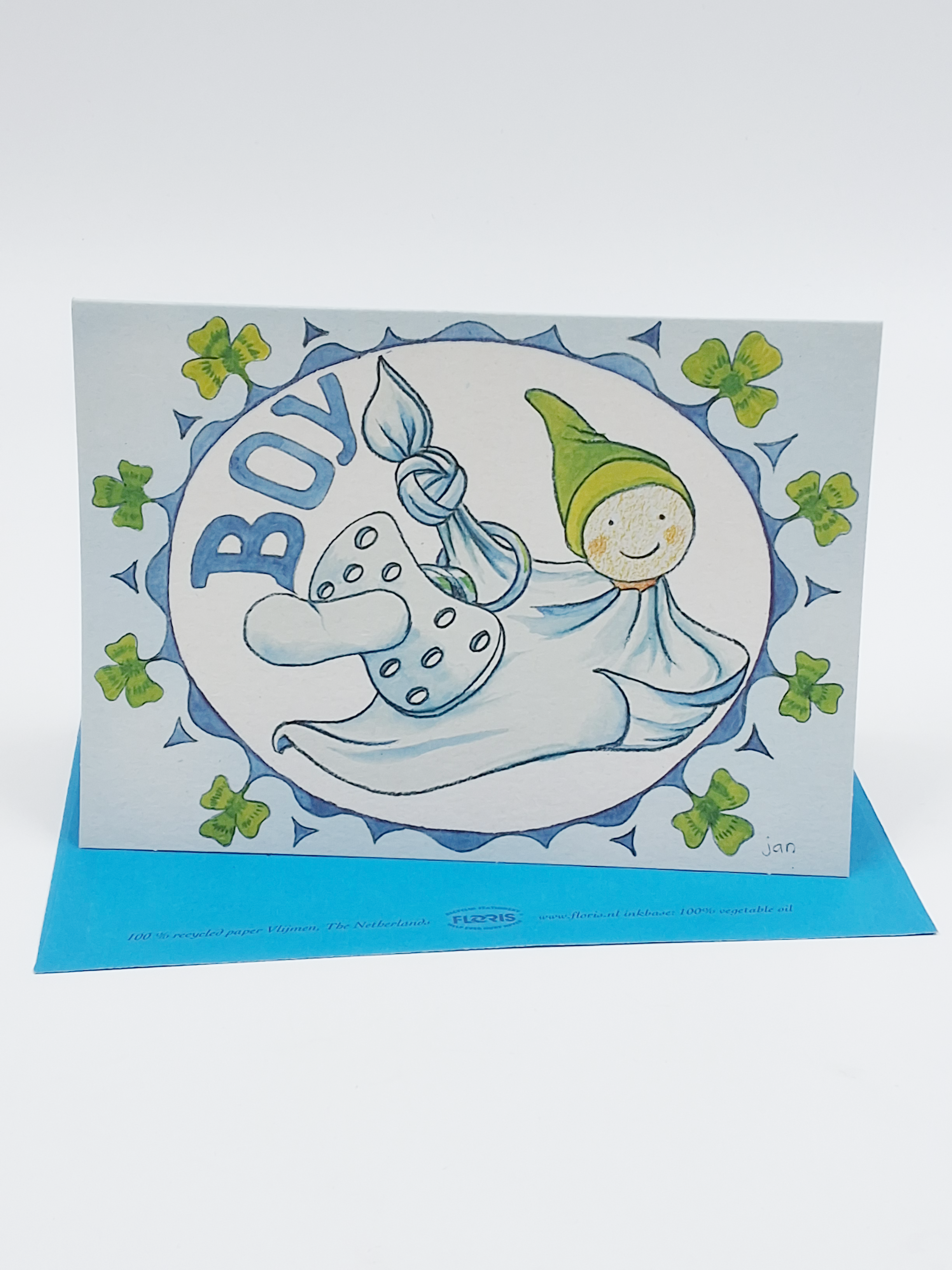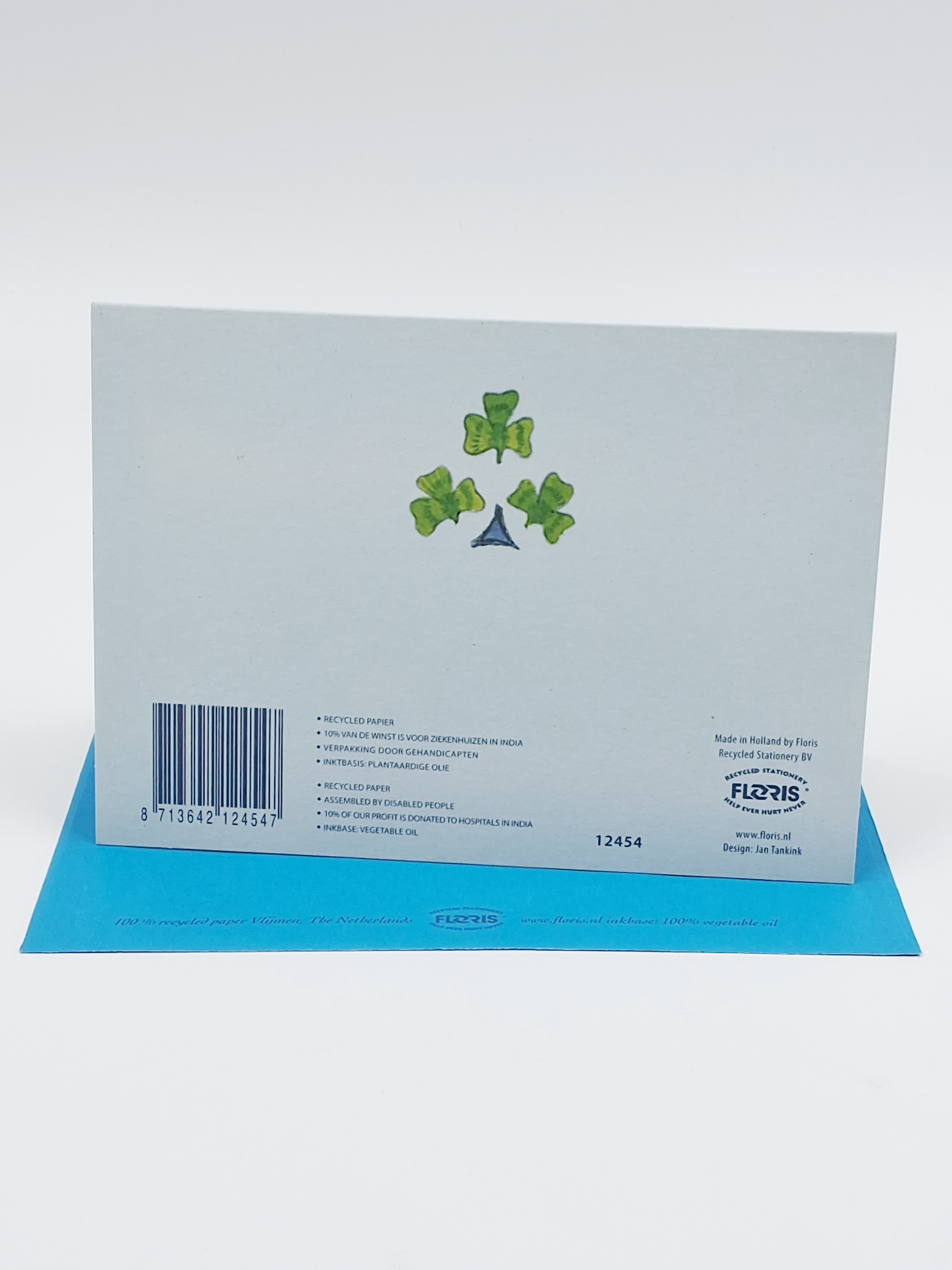 Onze wenskaarten zijn gemaakt van gerecycled papier en bedrukt met inkt op basis van plantaardige olie.