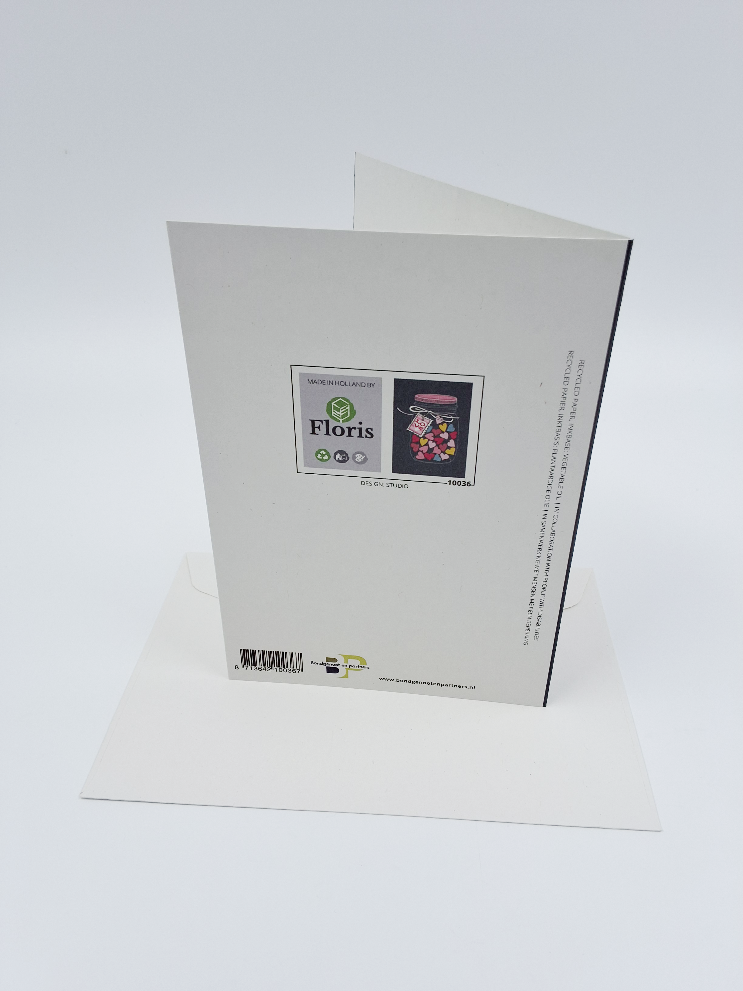 Onze wenskaarten zijn gemaakt van gerecycled papier en bedrukt met inkt op basis van plantaardige olie.