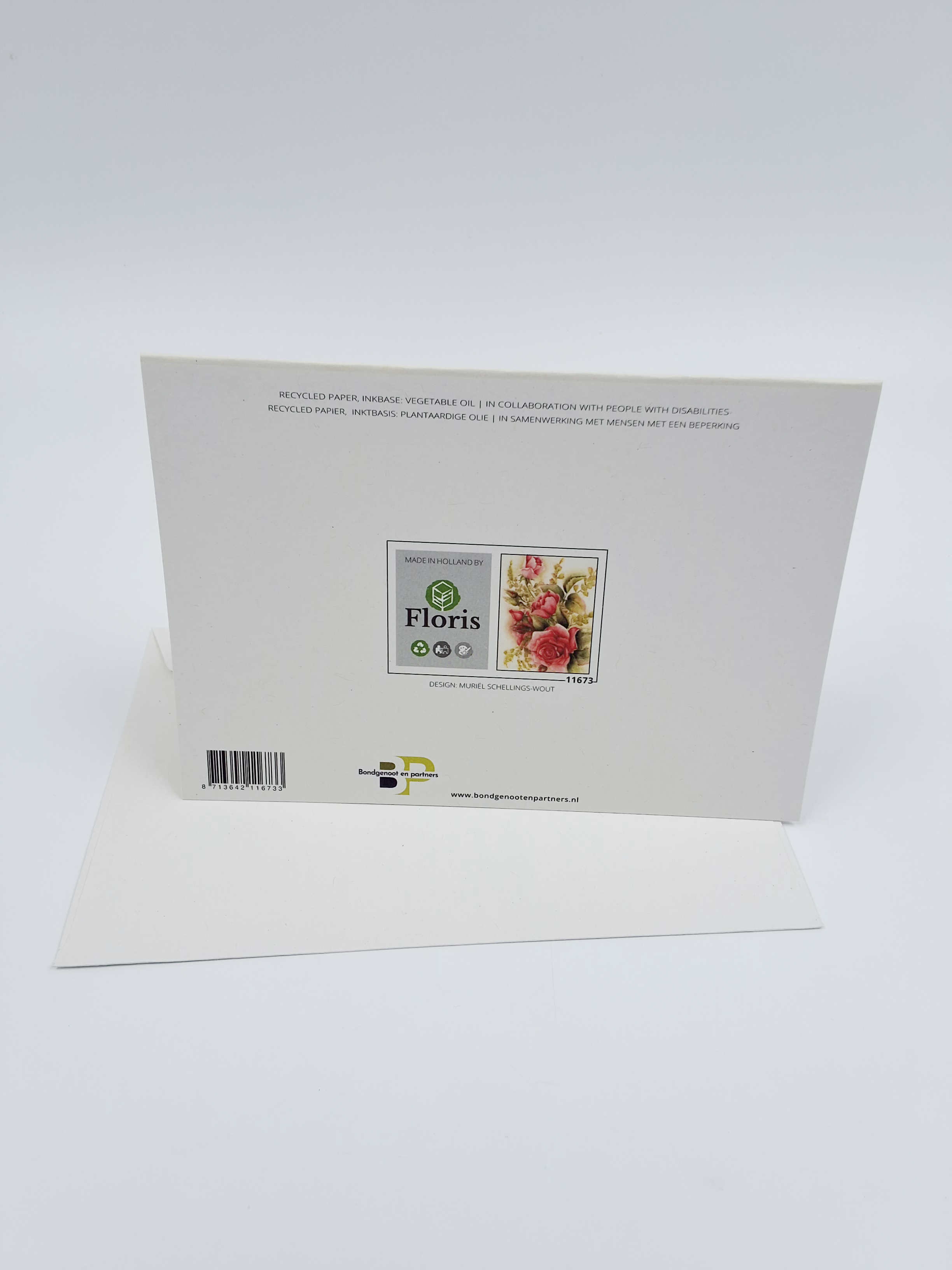 Onze wenskaarten zijn gemaakt van gerecycled papier en bedrukt met inkt op basis van plantaardige olie.