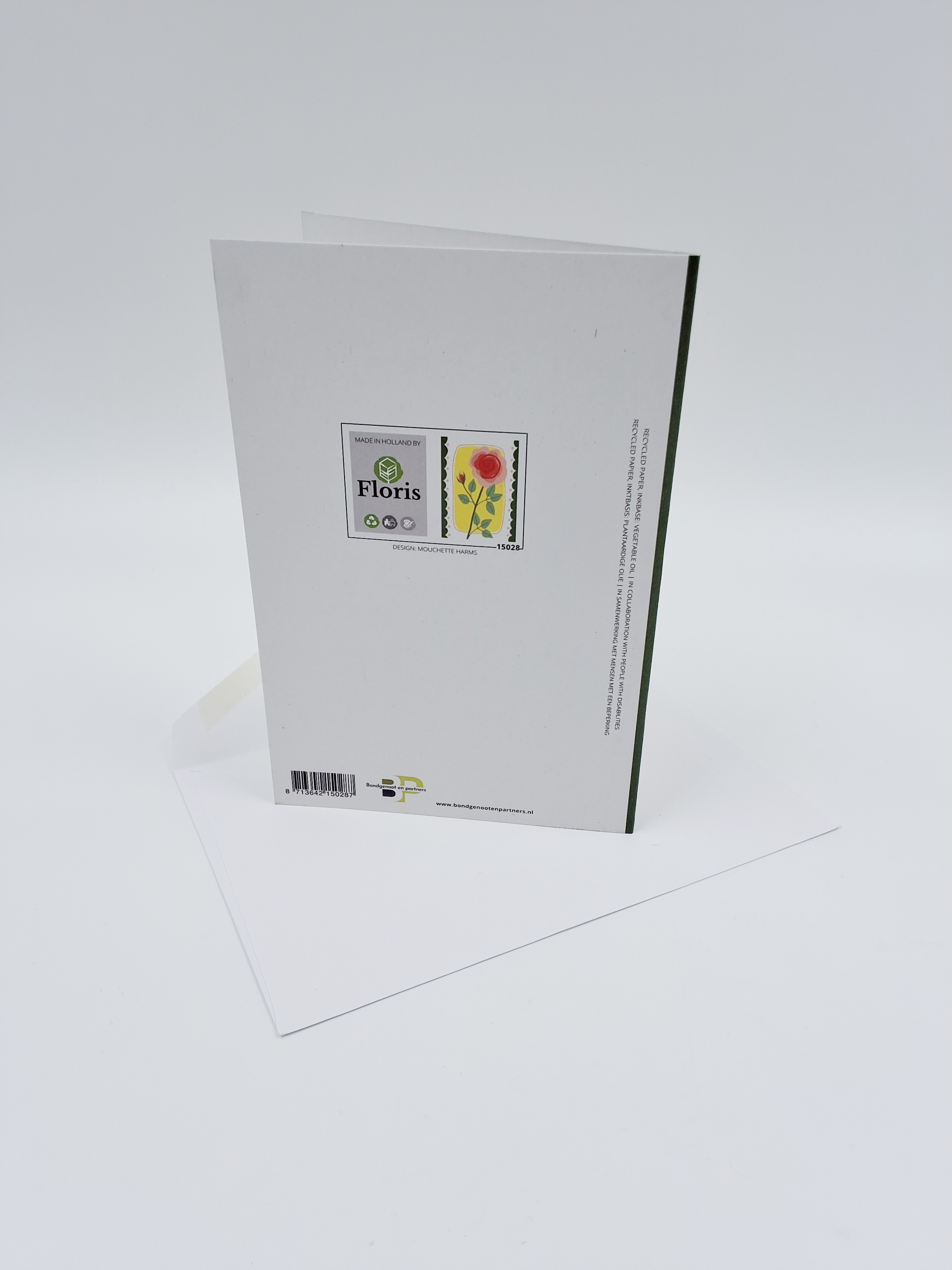 Deze wenskaart is iets groter dan een standaard wenskaart en heeft geen plastiek verpakking. Elke kaart komt met een passende envelop.