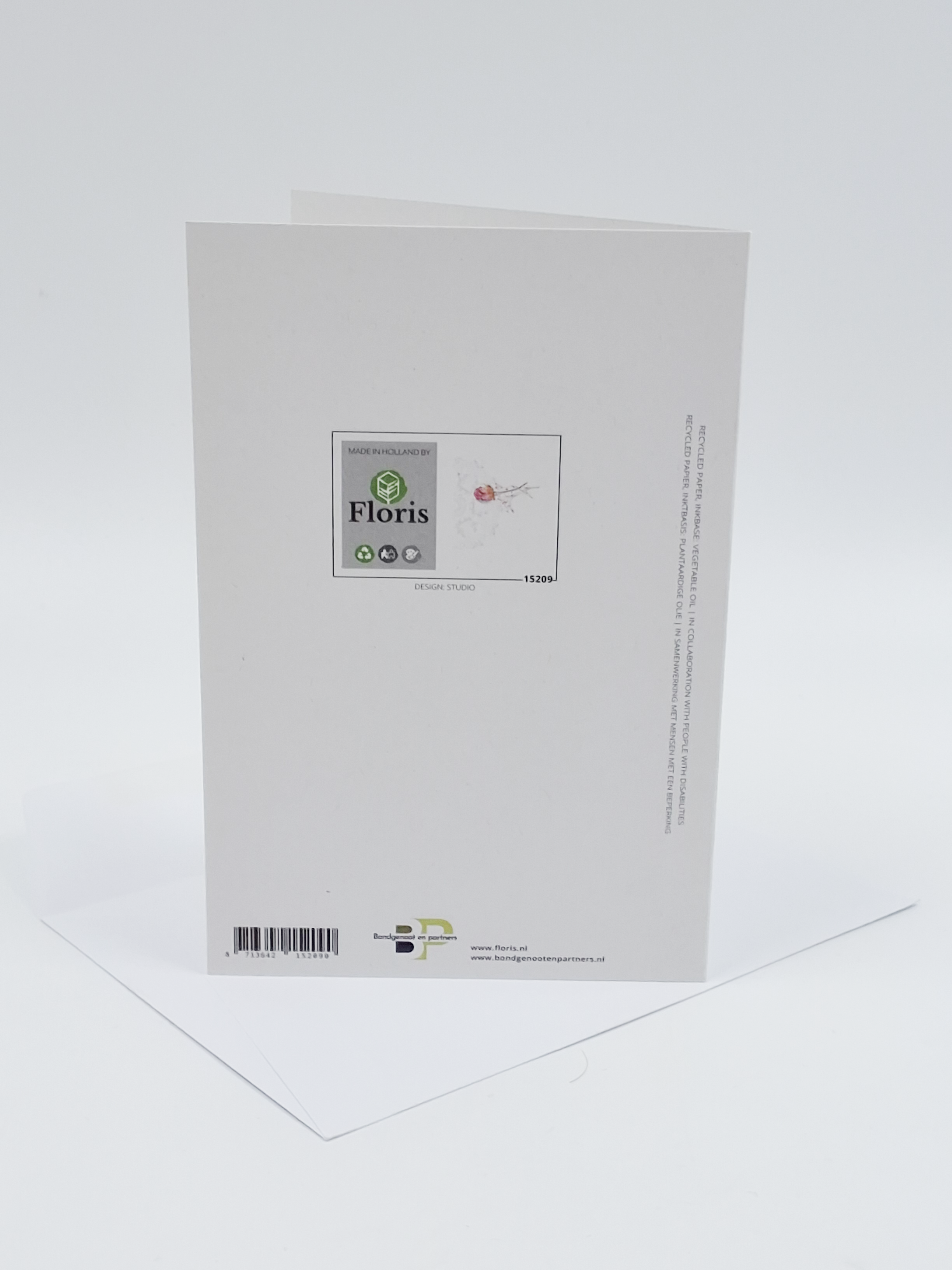 Deze wenskaart is iets groter dan een standaard wenskaart en heeft geen plastiek verpakking. Elke kaart komt met een passende envelop.