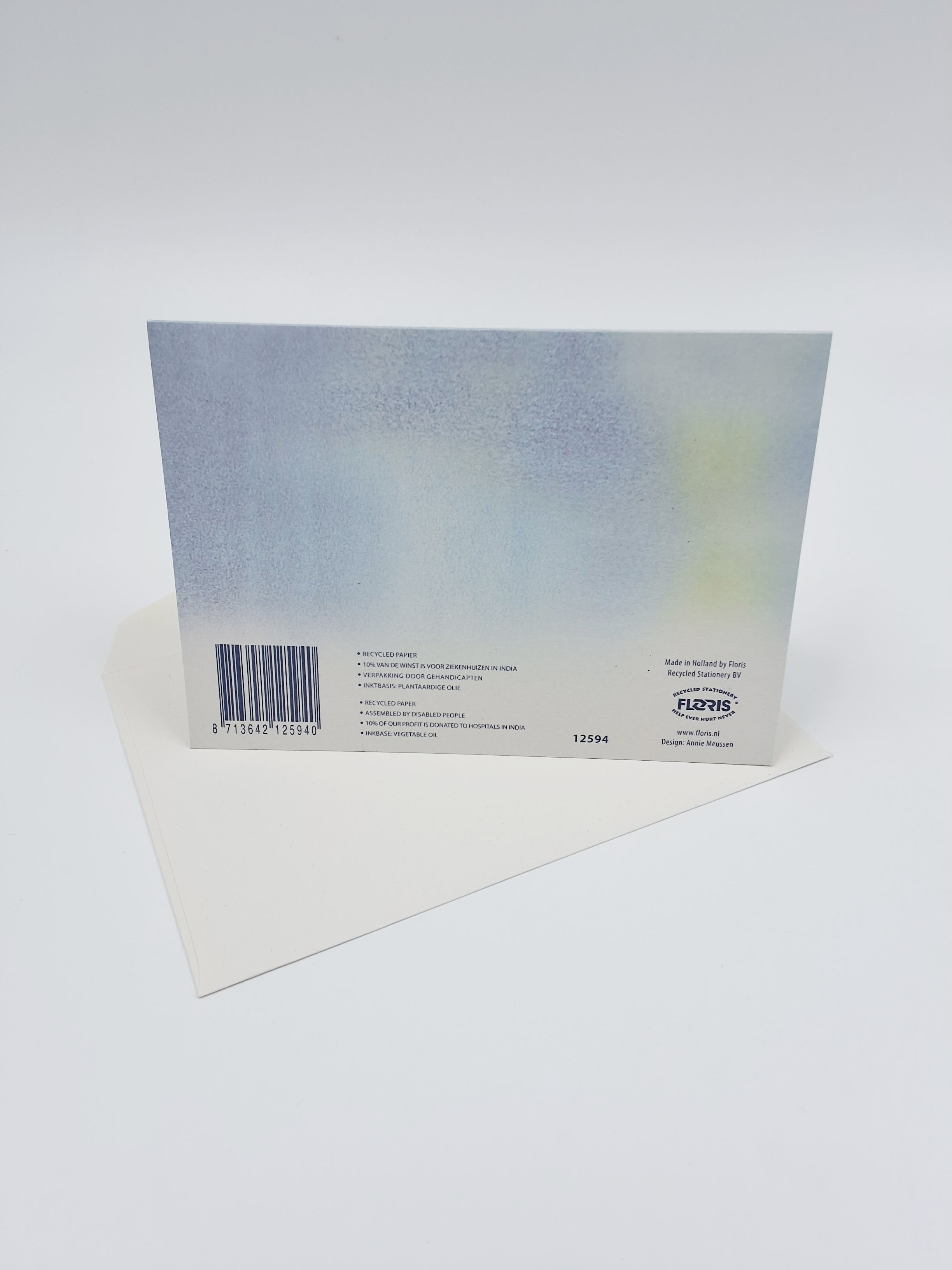 Onze wenskaarten zijn gemaakt van gerecycled papier en bedrukt met inkt op basis van plantaardige olie.