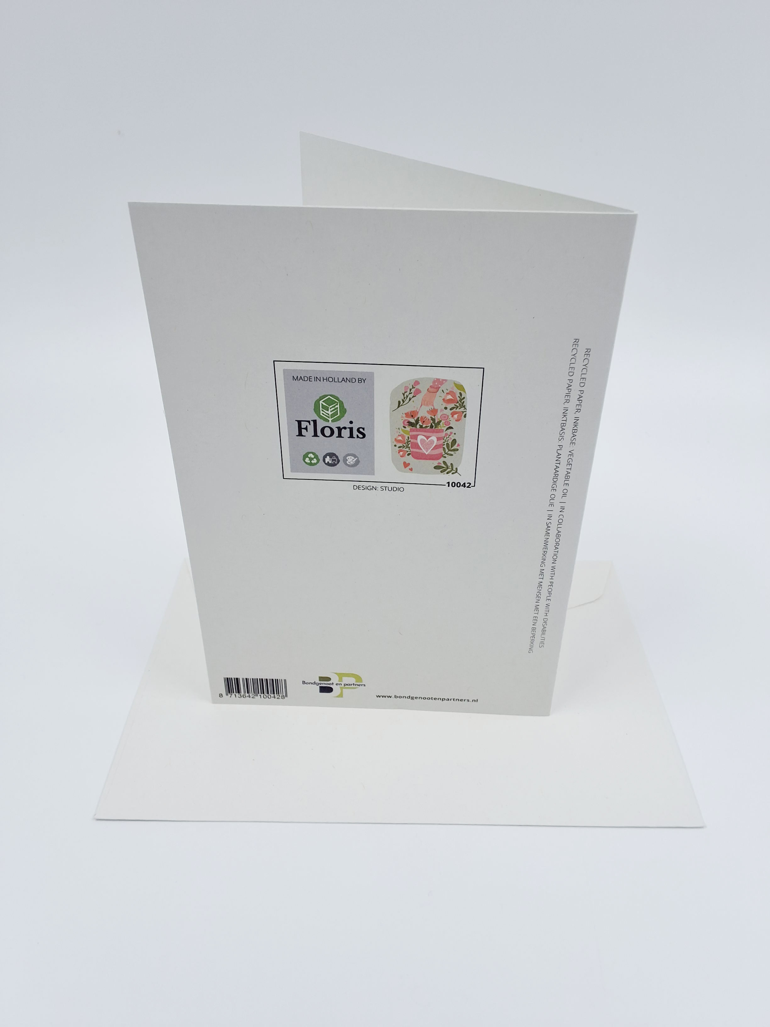 Onze wenskaarten zijn gemaakt van gerecycled papier en bedrukt met inkt op basis van plantaardige olie.